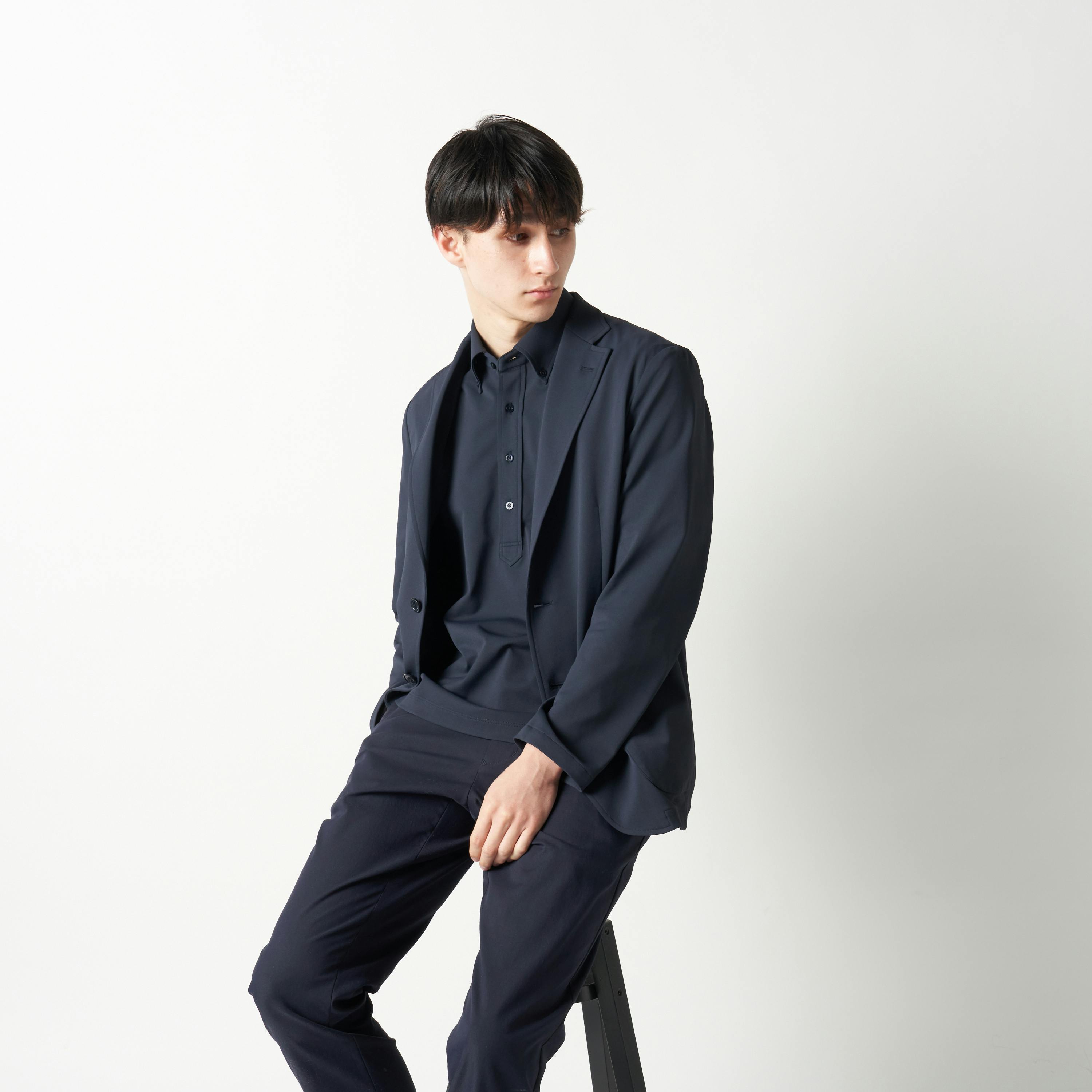 ジャケットを着用するとシャツを着ているかのように見えるので、カジュアルなイメージの強いプルオーバータイプでもきちんとした印象に。