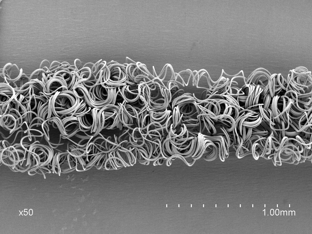 A:ポリエステル100%となります。東レが製造する複数の特殊なポリエステル原糸を複合して使用しています。