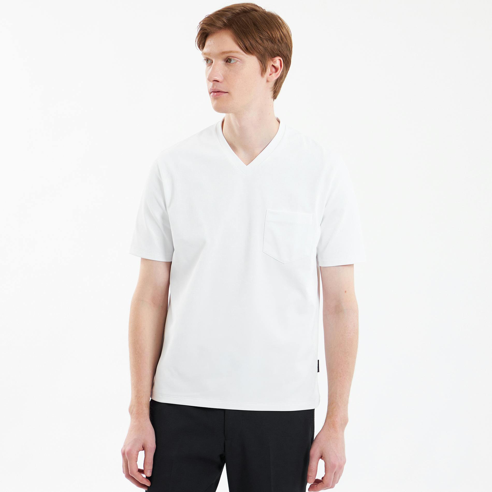 クルーネックはだらしなくないよう首回りにフィットし、Vネックも浅めの仕様で上品に。