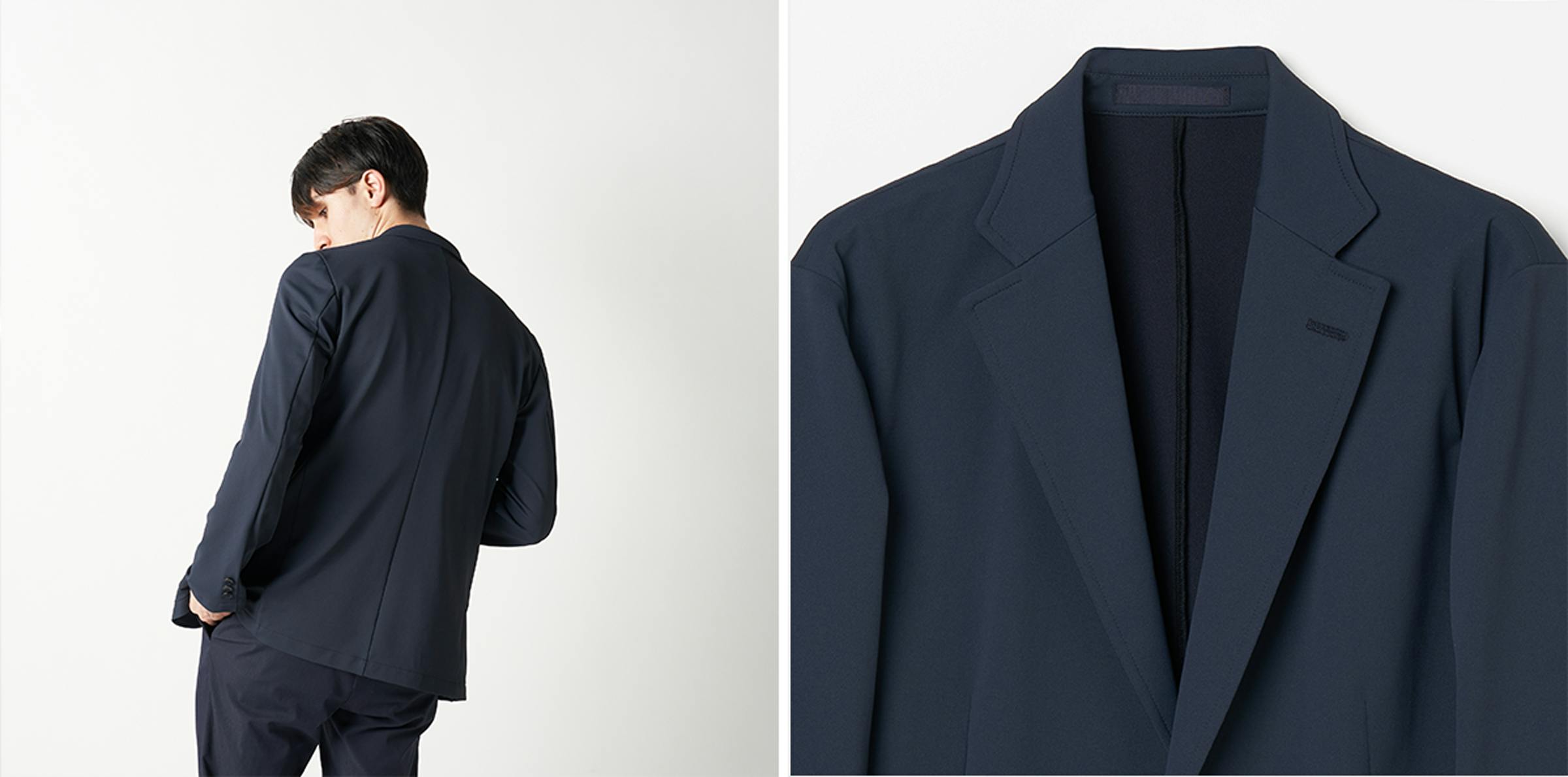 胸ポケットやベント、内ポケットを省くことでクリーンなルックスに仕上がっており、さらには軽量化も実現しています。