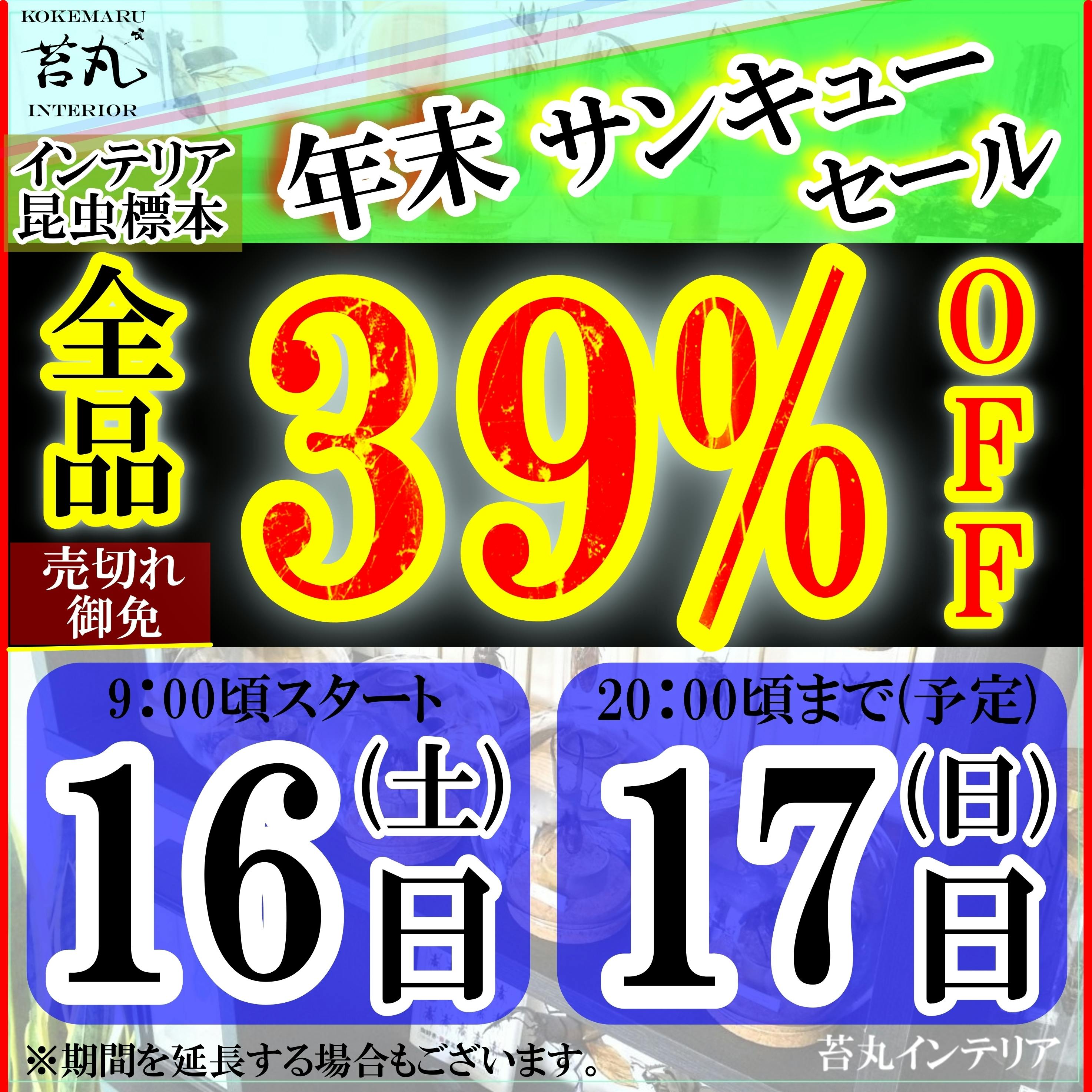 2023/12/13 21:46大決算 全品39%OFF サンキューセール開催について今年は、皆様への感謝の気持ちを込めて「サンキューセール」と題しまして、なんと全品39%オフの超値引きにて年末バーゲンを実施させていただくことを決めました!年に1回の超値引きキャンペーンであるこの機会に是非「インテリア昆虫標本」をお買い求めくださいませ!12月16日(土) 9:00スタート12月17日(日) 20:00頃まで全品売切れの場合は期限内でセールは終了とさせていただきます。1週間以内に発送いたしますので、クリスマスプレゼントにも間に合いますよ!↓苔丸インテリアのウェブショップへのアクセス方法(Instagramから)↓セール当日まで商品は「準備中」となり、ご購入いただくことができませんが、作品の内容や価格については閲覧可能です!当日は早い者勝ちとなりますので、是非事前に良さそうな作品があれば目星をつけておいていただけますと幸いです!!↓こんな感じに表示されるかと思います↓まだまだ事業者としては駆け出しで至らぬ点も多いですが、たくさんの方々からの応援をいただき、なんとかこの2年目もサービスを続け活動しきることができました。これからも昆虫好きの方々を増やし輪を広げられるような活動を心がけ、1人でも多くの昆虫好きの方々に喜んでいただけるサービス提供ができますよう、日々努力いたしますので、どうぞ今後とも宜しくお願いいたします! もっと見る