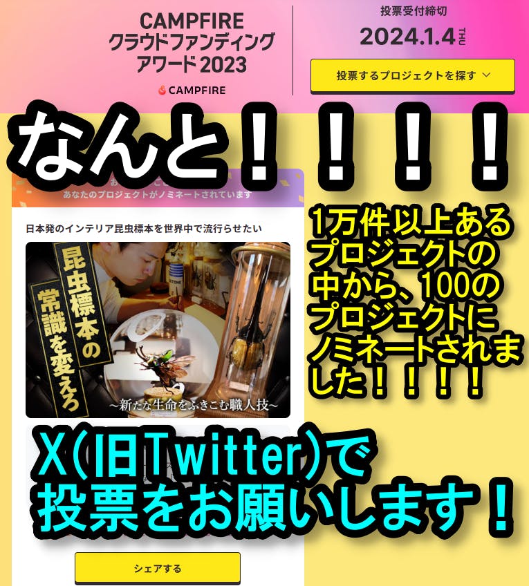 2023/12/22 20:28こんばんは!今日も元気にバリバリ活動中の苔丸でございますっ!!最近では海外のお客様にもインテリア標本をご提供できるまでに成長しておりますっ!(現在、アメリカ・イタリア・ドイツ・ブラジル・台湾に実績を作っております♪)さて、今日は皆さんにお願いがあって活動報告を書かせていただいております!!実は、皆さんが応援してくれている僕のプロジェクトが今回2023年度のクラウドファンディングアワード賞の100プロジェクトにノミネートされました!!!!1万件を超える数のプロジェクトの中から、ビックリですが100件の中に入り込むことができたようでして、やっぱり苔丸の勢い半端ないです(恒例の自画自賛)( ´∀` )この100件の中からさらに13件に絞って大賞が選定されます。そこで、皆さんにお願いがあるんですが、X(旧Twitter)で僕のプロジェクトへ「投票」をお願いしたいのです!!https://camp-fire.jp/awardsやり方は、⇧コチラのリンクからアクセスいただいて、「投票」を押してツイート(ポスト)ボタンを押すだけで完了です!!投票を頂いた方から抽選で賞品も当たる可能性があるそうです!!皆さんのおかげでこうして活動の幅を広げることができております。来年度はまたさらに活動の幅を広げられるよう色々考えておりますので、これからも是非僕の活動を応援いただけると嬉しいです。今後ともよろしくお願いします!!!! もっと見る