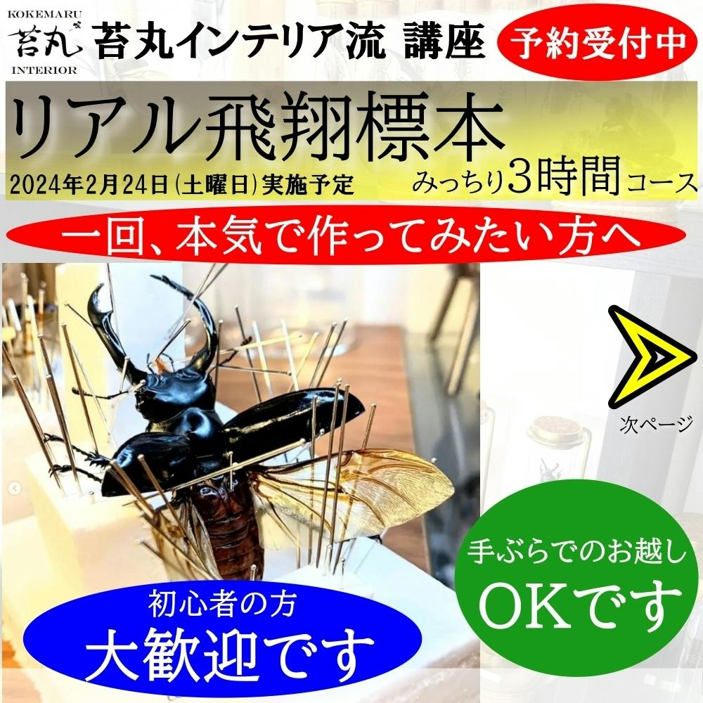 2024/01/19 17:34【苔丸インテリア流 リアル飛翔標本製作技術 習得講座(小型~中型昆虫編)】〈実施の詳細〉●日程:2月24日(土曜日)1部 9:00~12:00(3h) 定員7名2部 14:00~17:00(3h) 定員7名※1部、2部両方をご予約いただいても構いません。●時間 : 3h(休憩自由)・講師の自己紹介(10分程度)・講師(苔丸)による解説付き製作実演(40~50分程度)・残り時間は、ご自分のペースで製作に取り組んでいただきます。ご質問や製作手伝いなど、どんどん苔丸にお声掛けくださいね♪(100~110分程度)・片付けと締めのご挨拶、お帰りまで(10~20分程度)●開催場所:難波心斎橋駅前(レンタルオフィス)予定 ※詳細はDMで!●料金 : ¥10,000-(個体2頭付き※種類ランダム)※当日の製作個体をご自分で持参される場合は¥8,000-で受講可とします。持参昆虫の種類については事前にお知らせください。●完全予約制(7名ずつの2部)●年齢制限9歳(小学校高学年)~60歳※保護者付き添いでのお子様の参加OKです。〈受講での特典〉●製作手順やポイントをまとめたスライド用紙をプレゼントいたします!※講義中のメモなどは不要ですよー!●製作品はお持ち帰りいただけます。保管のための用品や袋も、料金内でご用意いたしますのでご安心下さい。手ぶらでお越しいただいてOKです!※完成後の標本展示用品は料金に含まれておりません。100円ショップなど安価い購入できる商品で安く展示する工夫についてはお伝えさせていただきますのでご安心ください。〈受講にあたっての注意点〉●講義内容の録音はご遠慮ください。●講義内容についてSNS等での共有を禁止いたします。感想等はもちろんOKです。●写真撮影に関しては、他の受講者が映らないよう配慮をお願いいたします。●講師の苔丸への学術的側面での逆指導等(指摘を含む)はご遠慮ください。ダイナミズムや魅せ方を重視する苔丸流として技術をお伝えします。是非楽しく技術を学びたい方のご参加をお待ちしております!今年もこのような形で活動を続けさせていただいております!!今後も温かく見守り応援をいただけると嬉しいです(⌒∇⌒) もっと見る