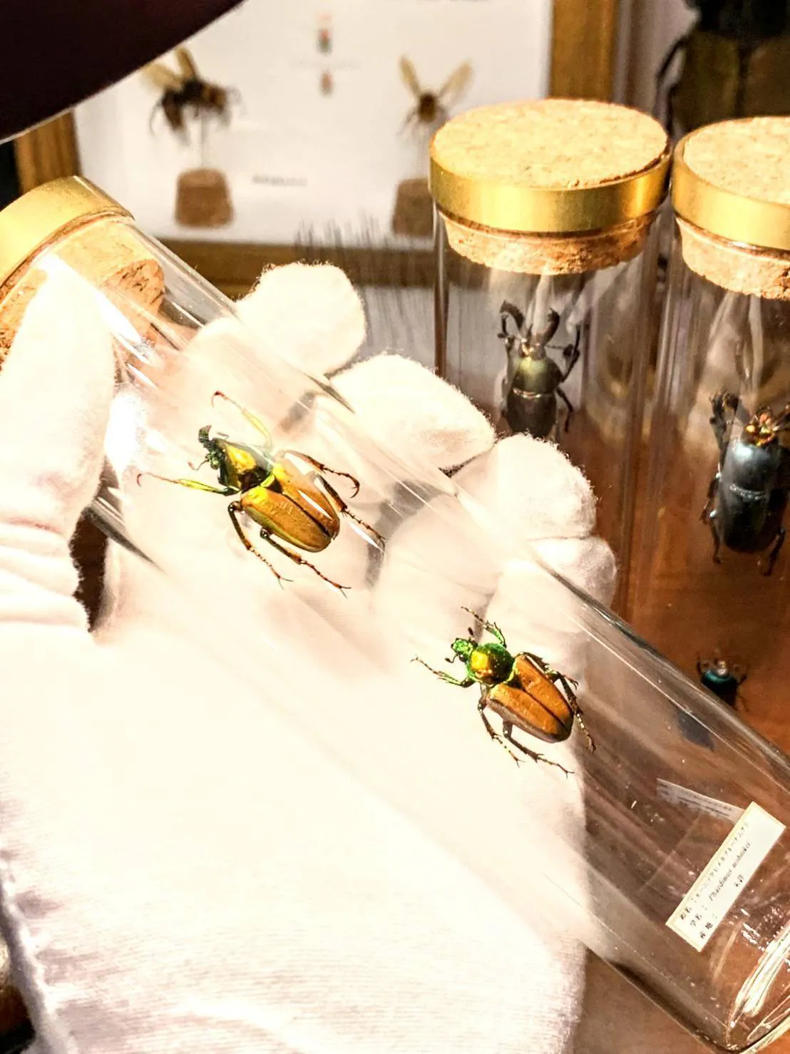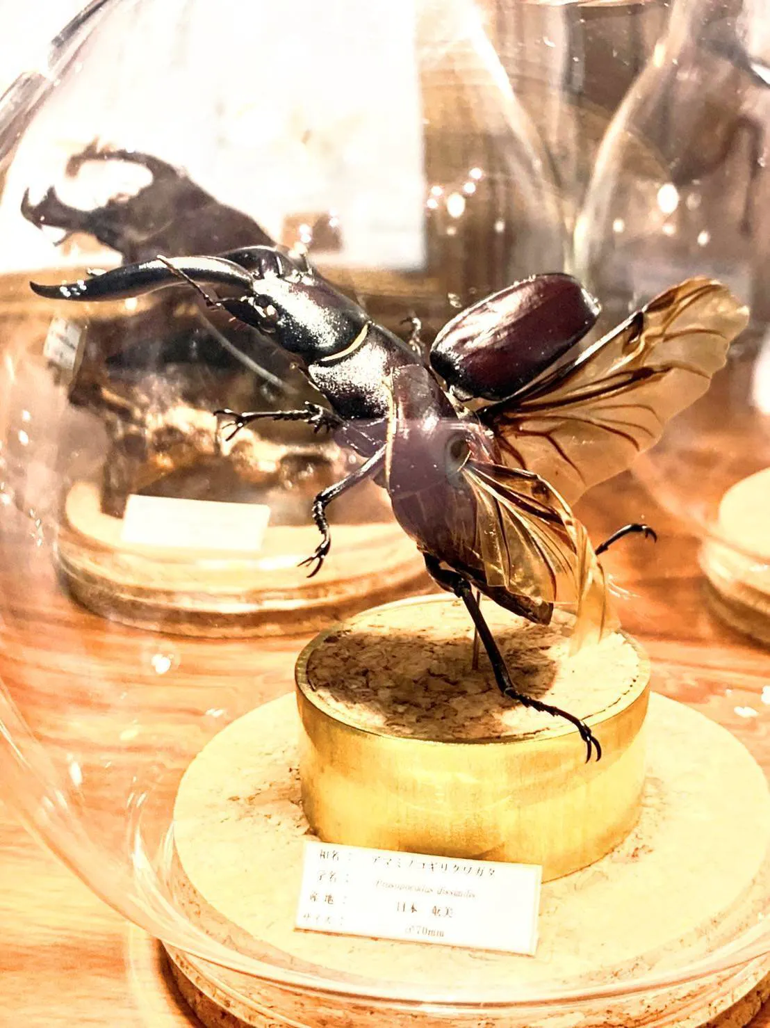 従来の標本が用いるドイツ箱と呼ばれる木の箱と異なり、ガラスビンやアクリル箱に入れることで、さまざまな角度から見て、楽しむことができます。