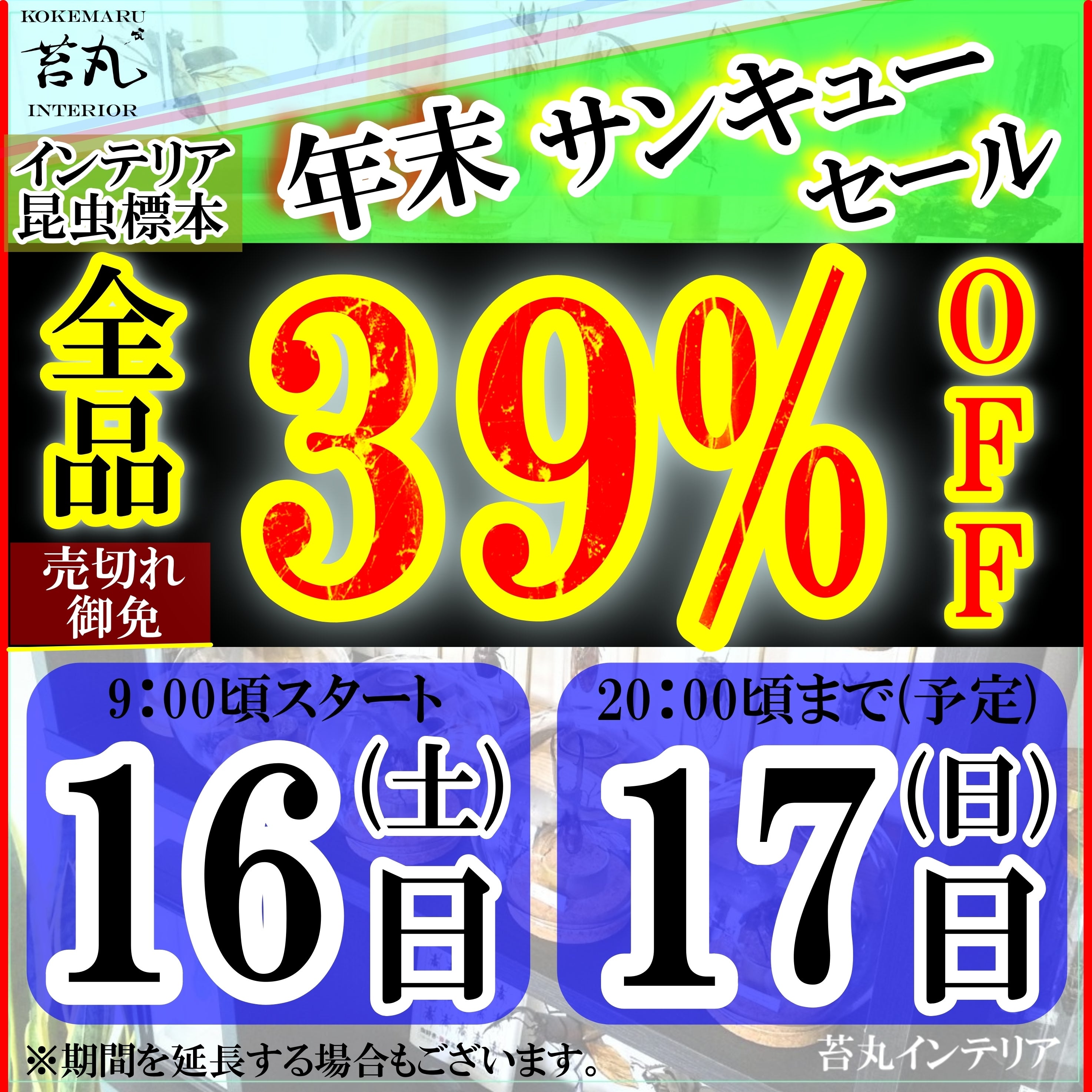 2023/12/13 21:46大決算 全品39%OFF サンキューセール開催について今年は、皆様への感謝の気持ちを込めて「サンキューセール」と題しまして、なんと全品39%オフの超値引きにて年末バーゲンを実施させていただくことを決めました!年に1回の超値引きキャンペーンであるこの機会に是非「インテリア昆虫標本」をお買い求めくださいませ!12月16日(土) 9:00スタート12月17日(日) 20:00頃まで全品売切れの場合は期限内でセールは終了とさせていただきます。1週間以内に発送いたしますので、クリスマスプレゼントにも間に合いますよ!↓苔丸インテリアのウェブショップへのアクセス方法(Instagramから)↓セール当日まで商品は「準備中」となり、ご購入いただくことができませんが、作品の内容や価格については閲覧可能です!当日は早い者勝ちとなりますので、是非事前に良さそうな作品があれば目星をつけておいていただけますと幸いです!!↓こんな感じに表示されるかと思います↓まだまだ事業者としては駆け出しで至らぬ点も多いですが、たくさんの方々からの応援をいただき、なんとかこの2年目もサービスを続け活動しきることができました。これからも昆虫好きの方々を増やし輪を広げられるような活動を心がけ、1人でも多くの昆虫好きの方々に喜んでいただけるサービス提供ができますよう、日々努力いたしますので、どうぞ今後とも宜しくお願いいたします! もっと見る