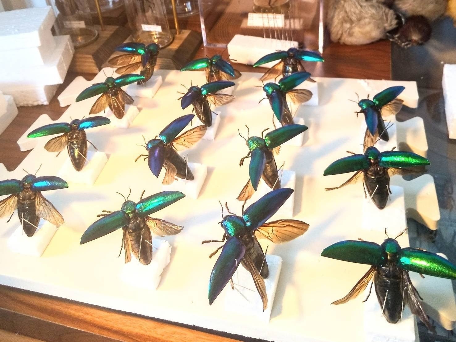 ですから、木に留まっている様子を彷彿とさせる状態でガラスビンに入れたり、羽を広げて飛んでいる姿を再現して「飛翔型」にしたり、これまでの標本とは一線を画するものばかり。