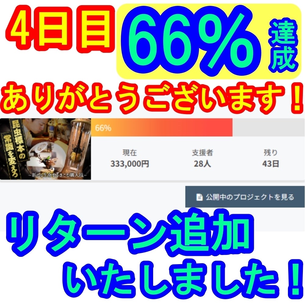 皆さん、こんばんは!まさかこんなにも多くの方から応援いただけるプロジェクトになるなんて、感謝カンゲキ雨嵐で御座います!!開始5日目にして目標金額の79%にまで達しております!このプロジェクトで支援いただいた資金は間違いなく次の活動資金へ使わせていただきます!引き続き応援よろしくお願いいたします!さて、今週末の4月23日(日)は、関西最大規模の昆虫イベント「インセクトディスカバリー」ですね!今回のインセクトディスカバリーは初めて、お客さんとしてではなく出展者側として参戦いたします!是非みなさん可能であれば僕のブースへお立ち寄りください!!下手くそなサインを書かせていただきます。(⇦サインなんかありませんが、練習しといた方がいいですか!?)皆さんにお会いできるのを楽しみにしております。今回お会いできなくても今年は全国いけるところに行きたいと思いますので、お近くの時は是非ご連絡ください(⌒∇⌒)