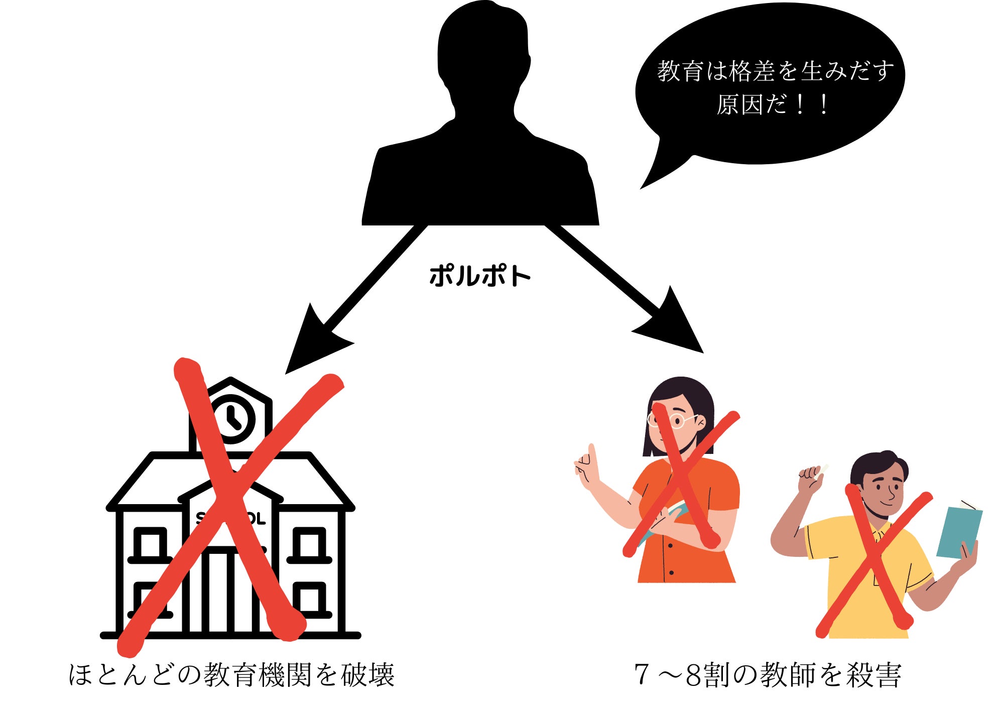 そこで格差を生み出す原因となる学校教育を否定し極端な原始共産制の実現を強行しました。この時、小学校、中学校、高校、大学の教育機関はほとんど破壊され、7~8割の教師が殺害されるなど、カンボジアの教育基盤は徹底的に破壊されました。