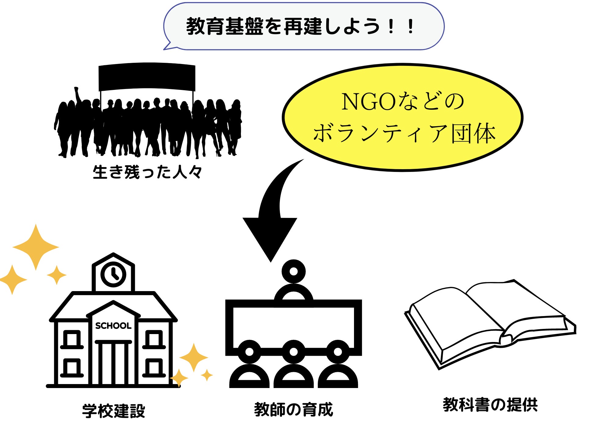 1979年のポル=ポト政権崩壊後、生き残った人たちや各国のボランティア団体の協力により学校建設、カンボジアの教師の教育、教科書の支援など様々な支援が行われ、多くの子どもたちが学校に通えるようになりました。