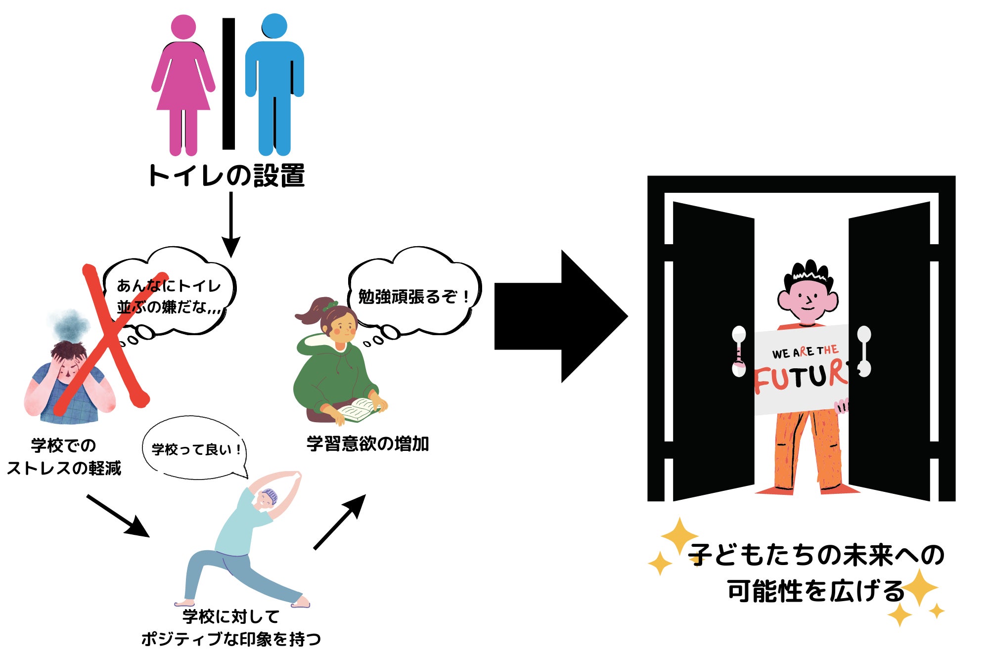 調査によってトイレ不足が原因で子どもたちの貴重な勉強時間が妨げられていることが分かりました。トイレを設置し、並ぶ時間を短くすることで少しでも多くの時間を勉強時間に充てられるようにしたいです。また今までトイレに並ぶことに費やしていた時間を遊びやその他の自分のしたいことに充て、うまく気分転換をし、次の授業に集中できる環境を目指します。