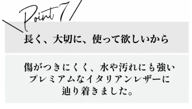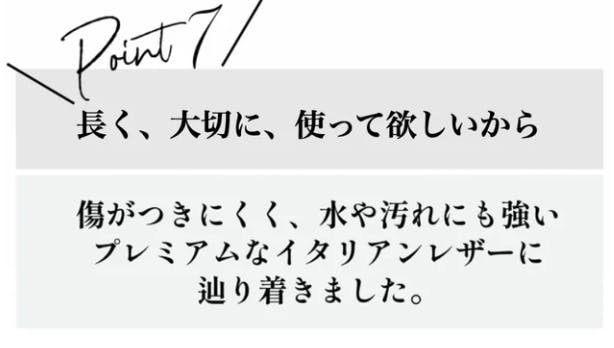 ③長く、大切に使って頂きたい、という想いから、傷や汚れがつきにくく、長く美しさを保てるイタリア製プレミアムレザーをイタリアから直輸入し使用。