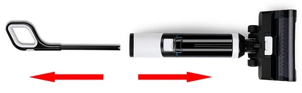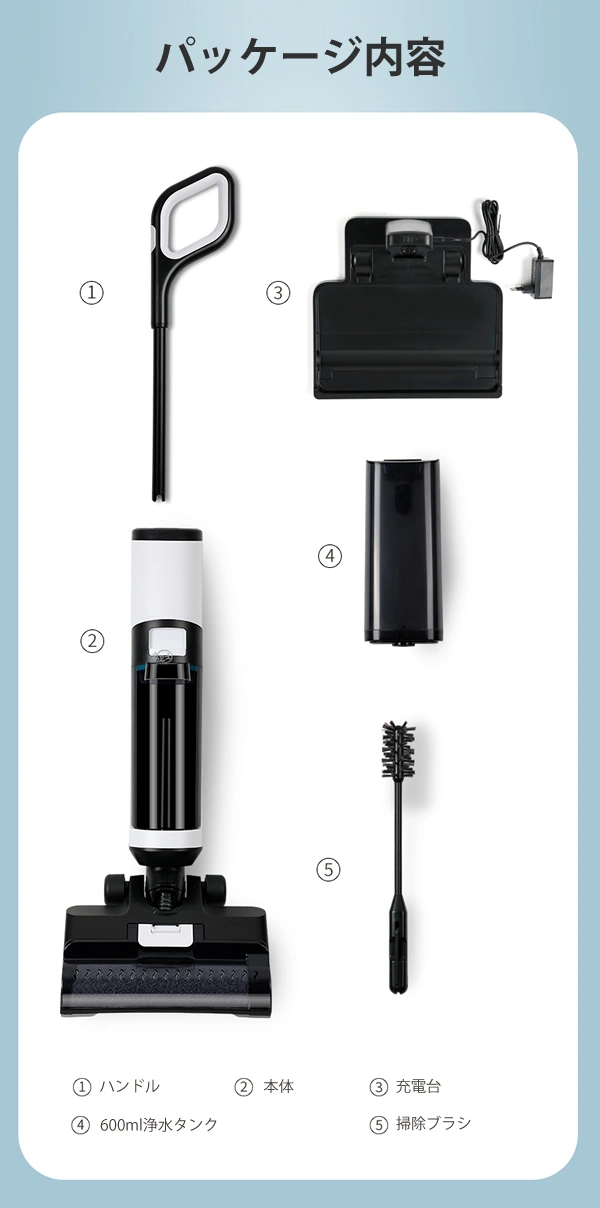 A. お届けの際は本体と取っ手を組み立てていただきます。充電が完了したら取っ手のスイッチをONにすると本体が起動し直ぐに掃除が出来ます。