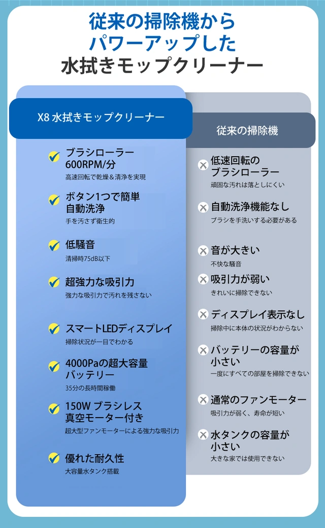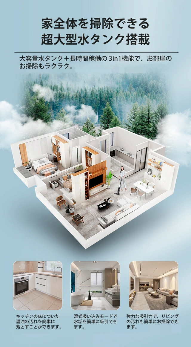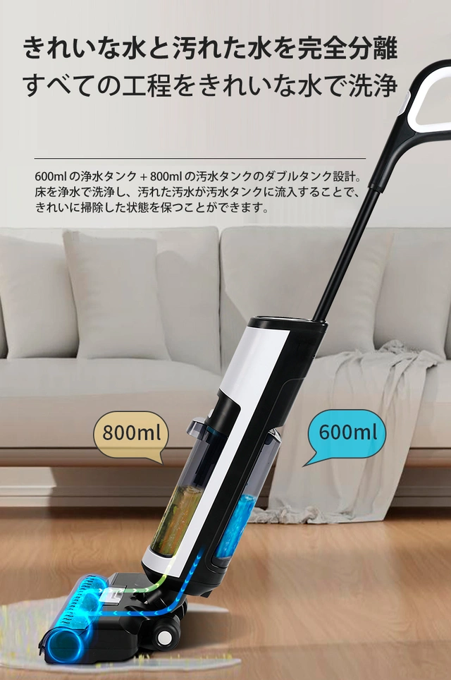 IZELL-X8は吸引、水拭き、を同時に行う事ができます。