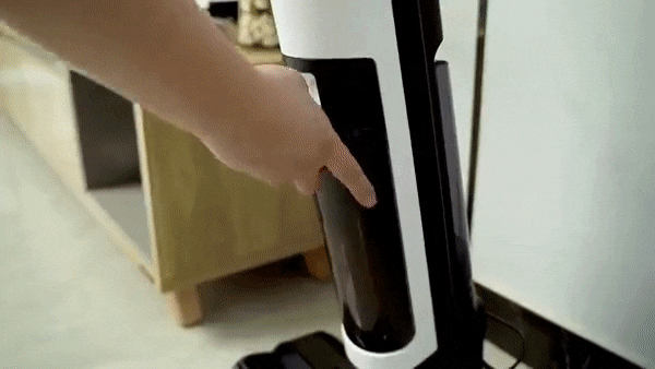 専用充電台に戻しボタンを押すと約90秒のモップ自動洗浄が開始します。