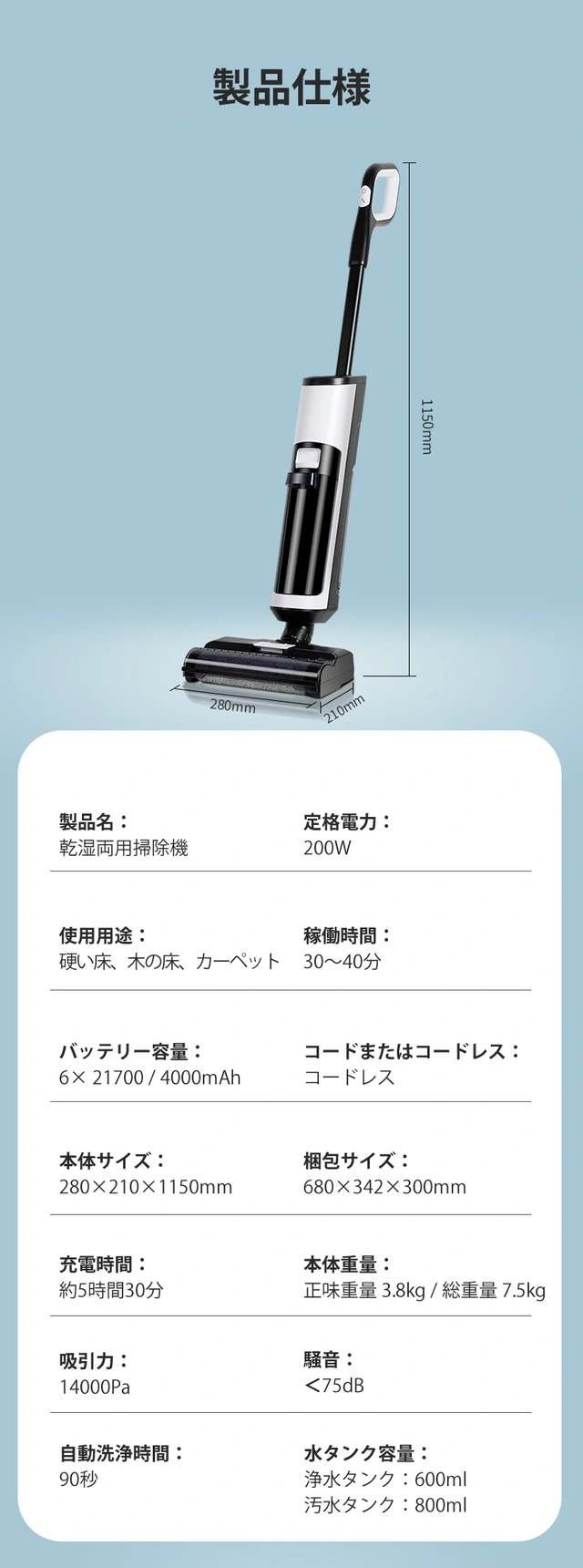 IZELL-X8は水ぶきモップ掃除機の中では騒音が少ない75dB以下とバスの車内位のレベルで設定されています。