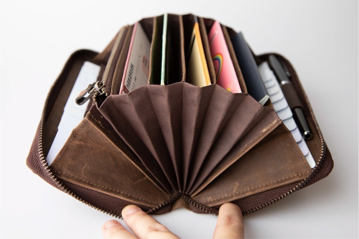 出張の多いビジネスマンの方は、パスポート、新幹線の乗車券や航空チケット、外貨などまとめられるオーガナイザーとしても使えます。出張した際には、経費を出張費として経費精算する必要があるので、タクシー代のレシートなど保管する必要があります。ジャバラ式ポケットは、私用な買い物と経費のレシートを仕分けするのに役立ちます。ゴムバンドは、ペンホルダーとしても使えるので、出張先で急な連絡が入りスケジュールやメモを記入する時にペンをサッと取り出すことができます。