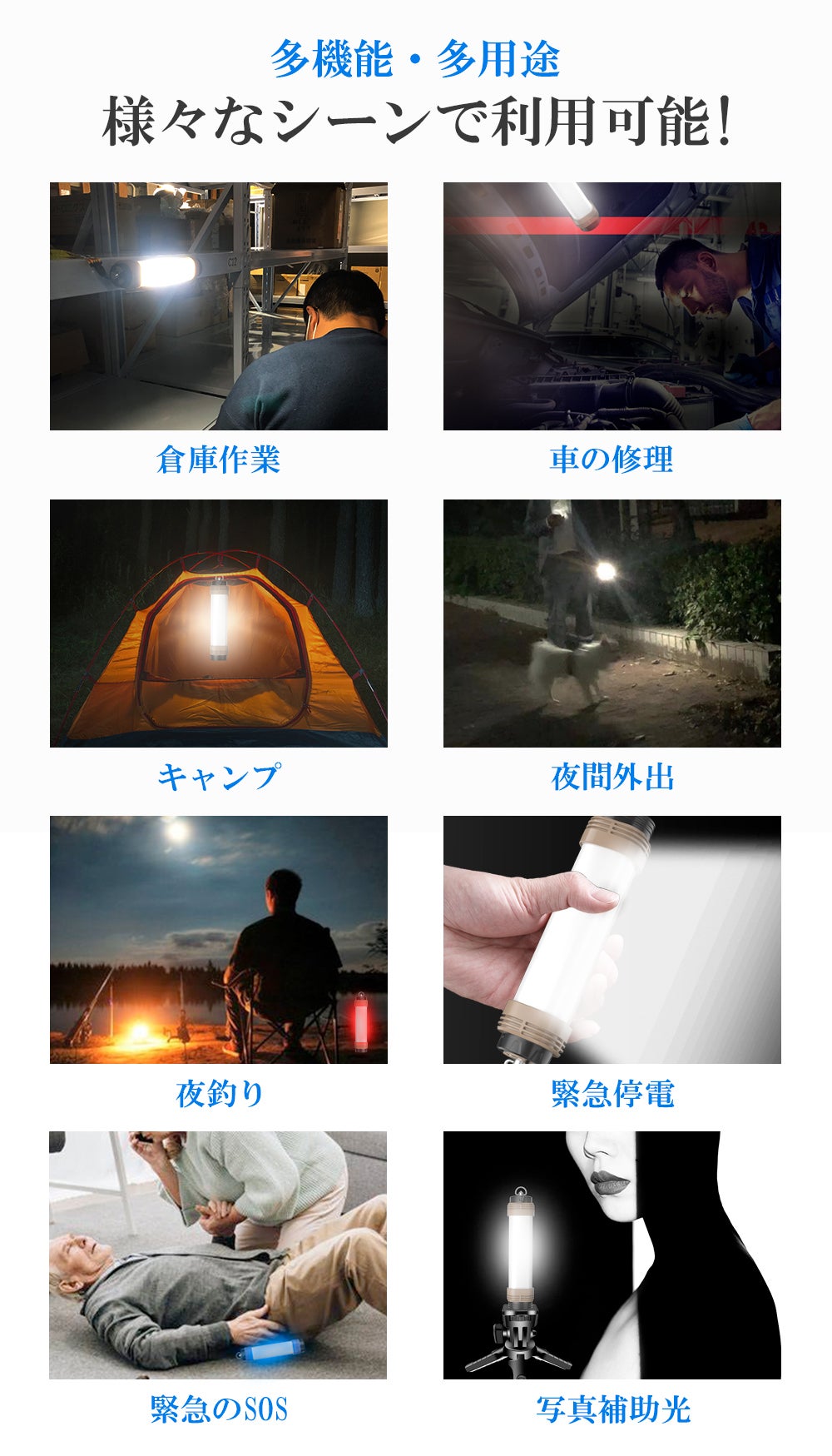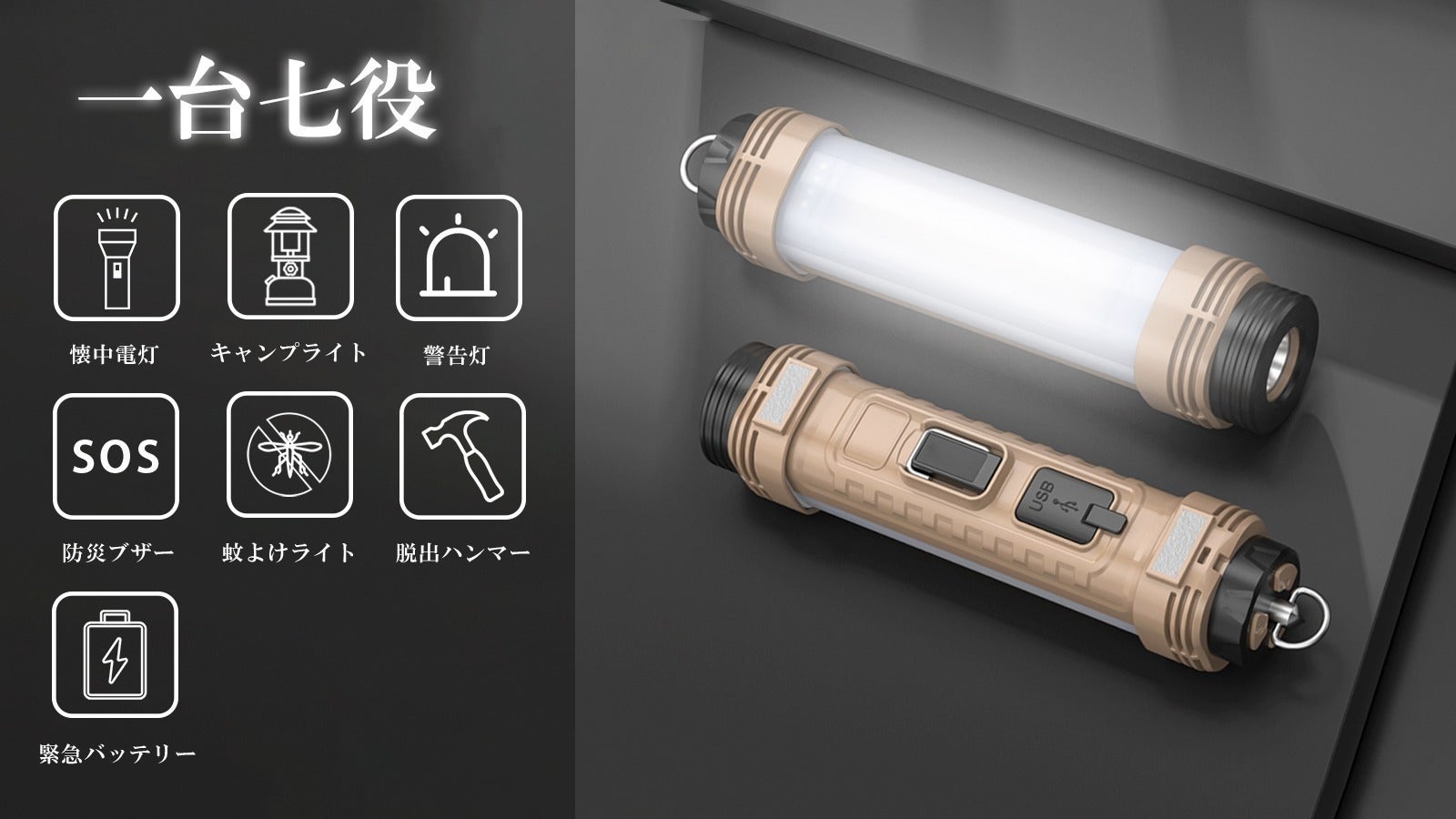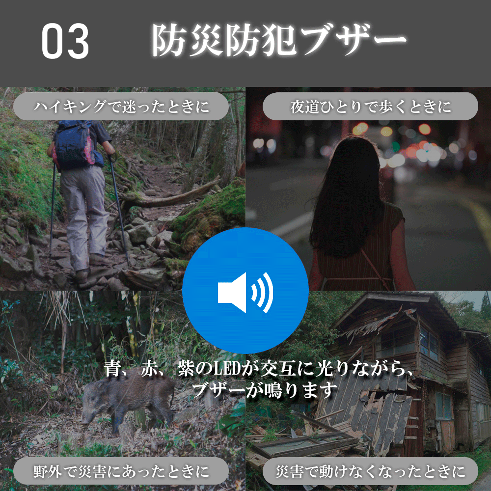 もしもの備えに役立つ機能で、登山、犬の散歩、パトロールなどのアウトドアや、万が一の故障時の予備車用品、家庭防災グッズとしても活躍します。