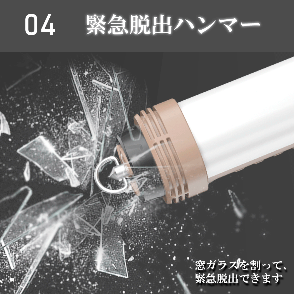 火事や洪水など緊急時の脱出に役立つガラス破砕先端で、素早く外に脱出できるようにします。