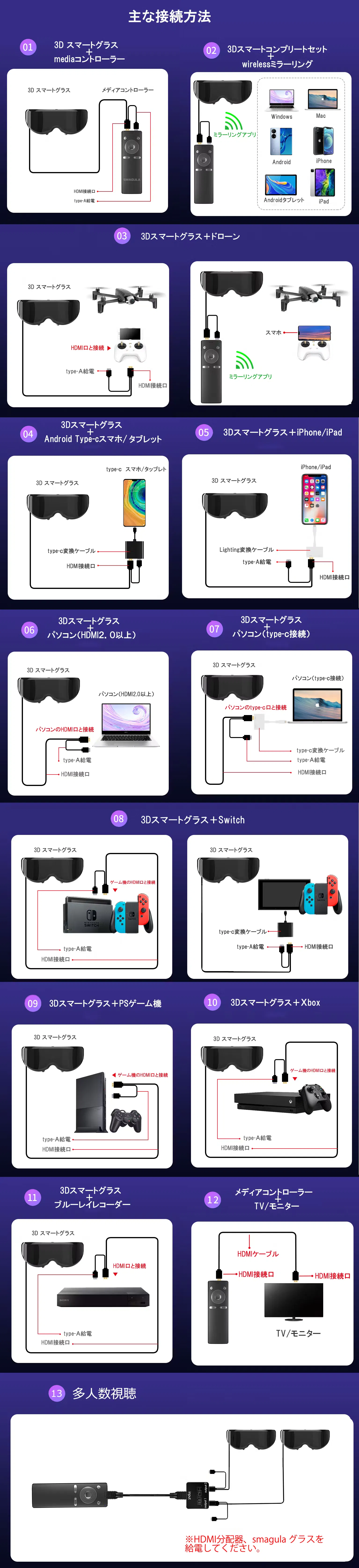 A:3Dグラスの場合デバイスのOSは問わず、HDMI出力対応なデバイスに対応しています。(Android、iOS、Switchなどの場合変換ケーブルが必要、純正品をお勧めします。)コントローラーの場合デバイスOS問わず、ミラーリング送信可能なデバイスに無線対し、HDMI出力可能なTVやモニターをHDMIケーブルで接続できます。