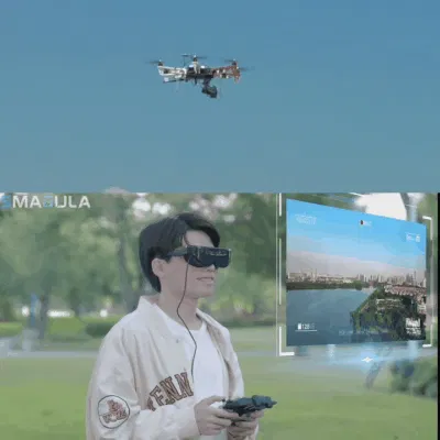 ドローンと接続しているスマホをメディアコントローラーを介してミラーリング。動画をリアル撮影でき様々な角度から楽しめます。
