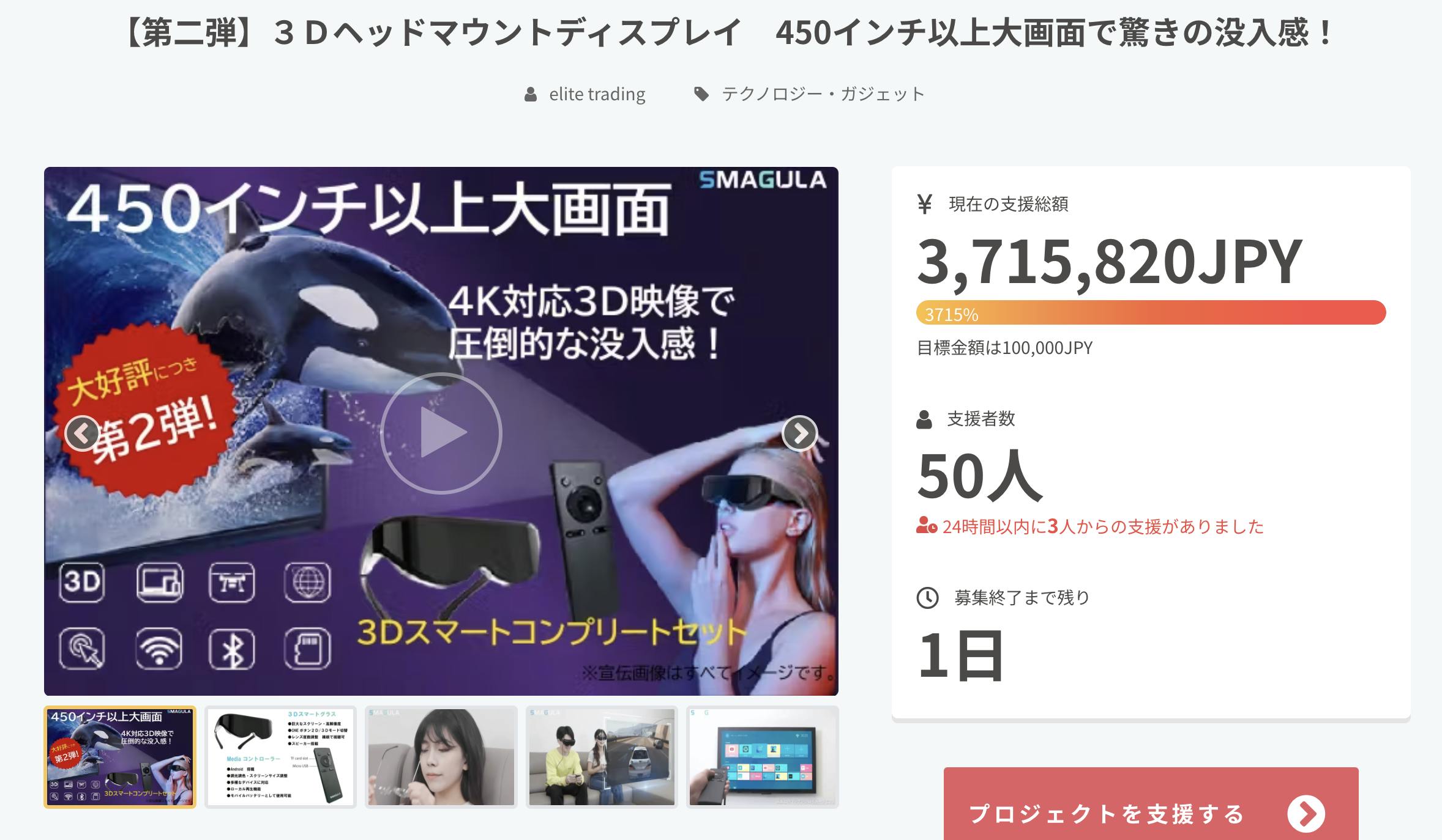 2023/05/30 09:19ご支援者の皆様こんにちは!エリート貿易です!現在370万を超える支援購入を頂いております。プロジェクトは残すところ、あと38時間で終了します。camp-fire限定の割引価格は5月31日23:59までです。まだ、検討で悩まれている方、お早めに支援購入お待ちしております。引き続きよろしくお願いいたします。 もっと見る【残り7日間】SMAGULAプロジェクトのご報告