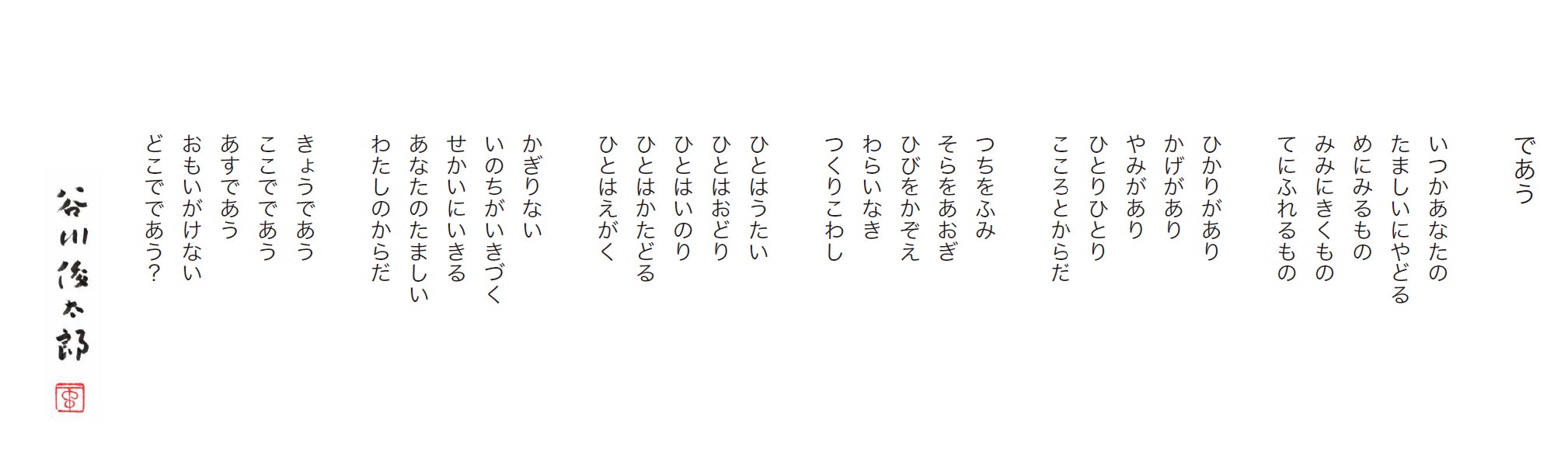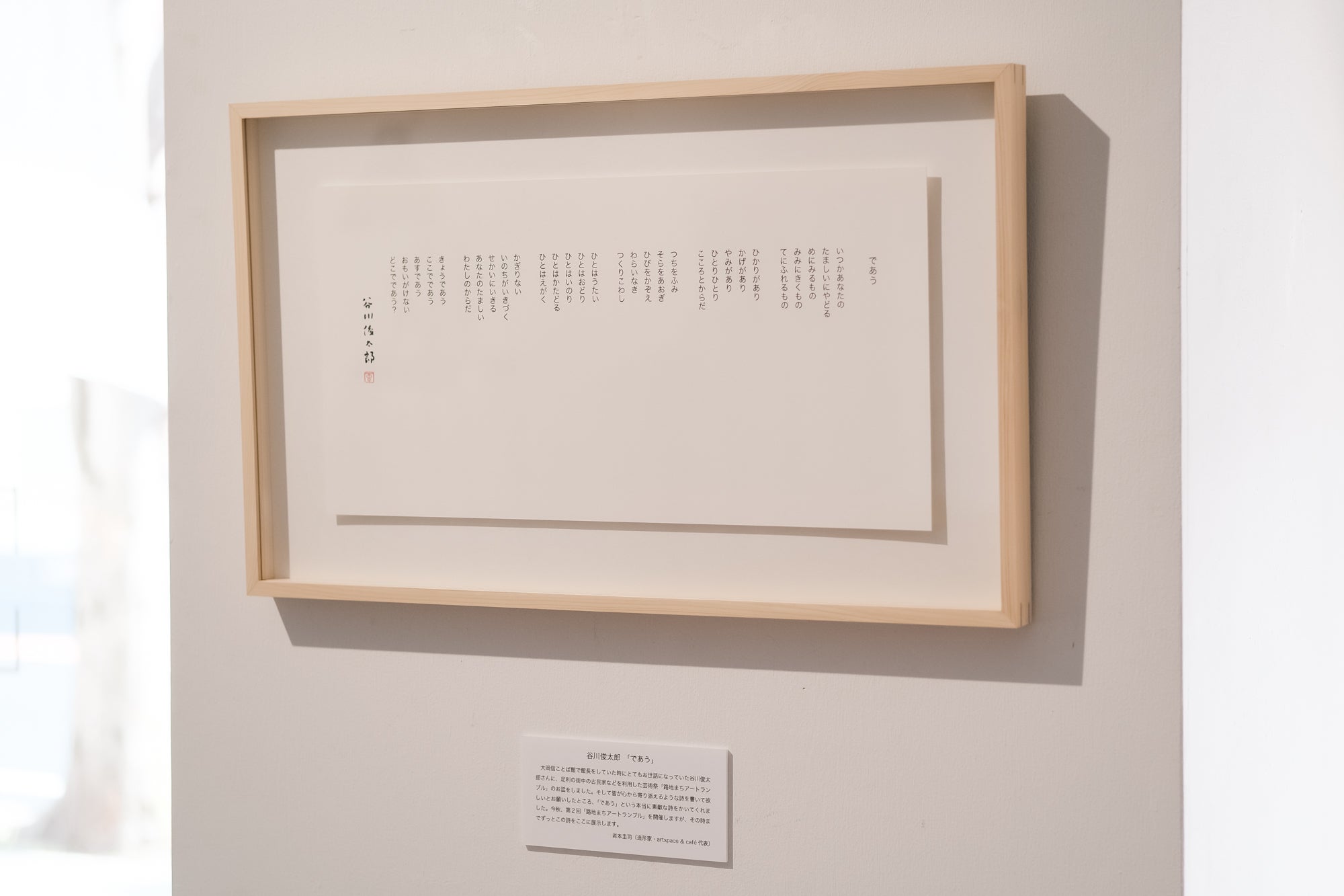 『2023 路地まちアートランブル』のディレクターを務める、岩本圭司(『大岡信ことば館』元館長)より、谷川俊太郎さんにこの想いの連鎖と関わる人たちの熱量を伝え、今後の取り組みの芯となる言葉をお願いできたらという相談からうまれた『であう』という詩。