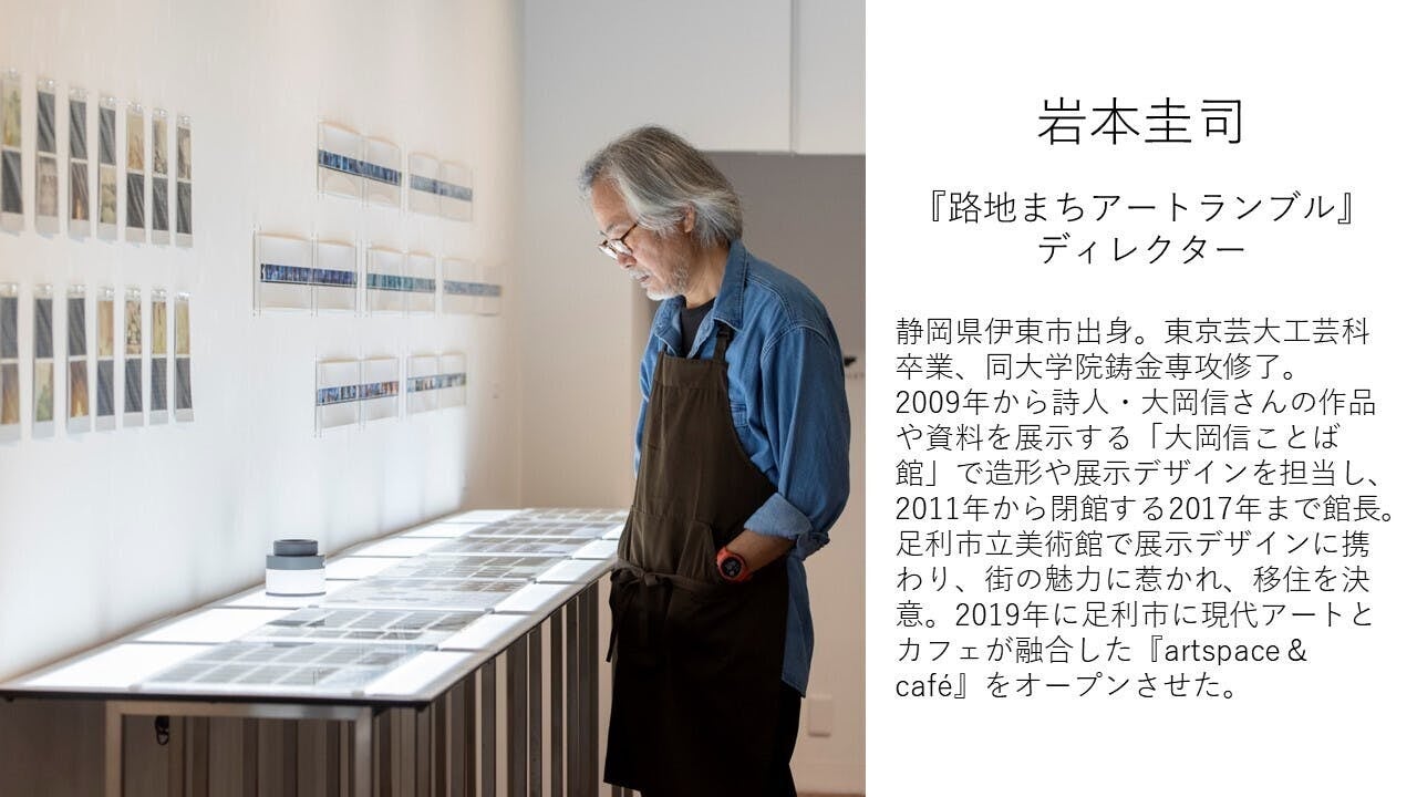 みなさんこんにちは、今回ディレクターを務めます岩本圭司(造形家・artspace & café代表)です。 足利との関わりは足利市立美術館で開催された吉増剛造さんの展覧会での仕事からでした。