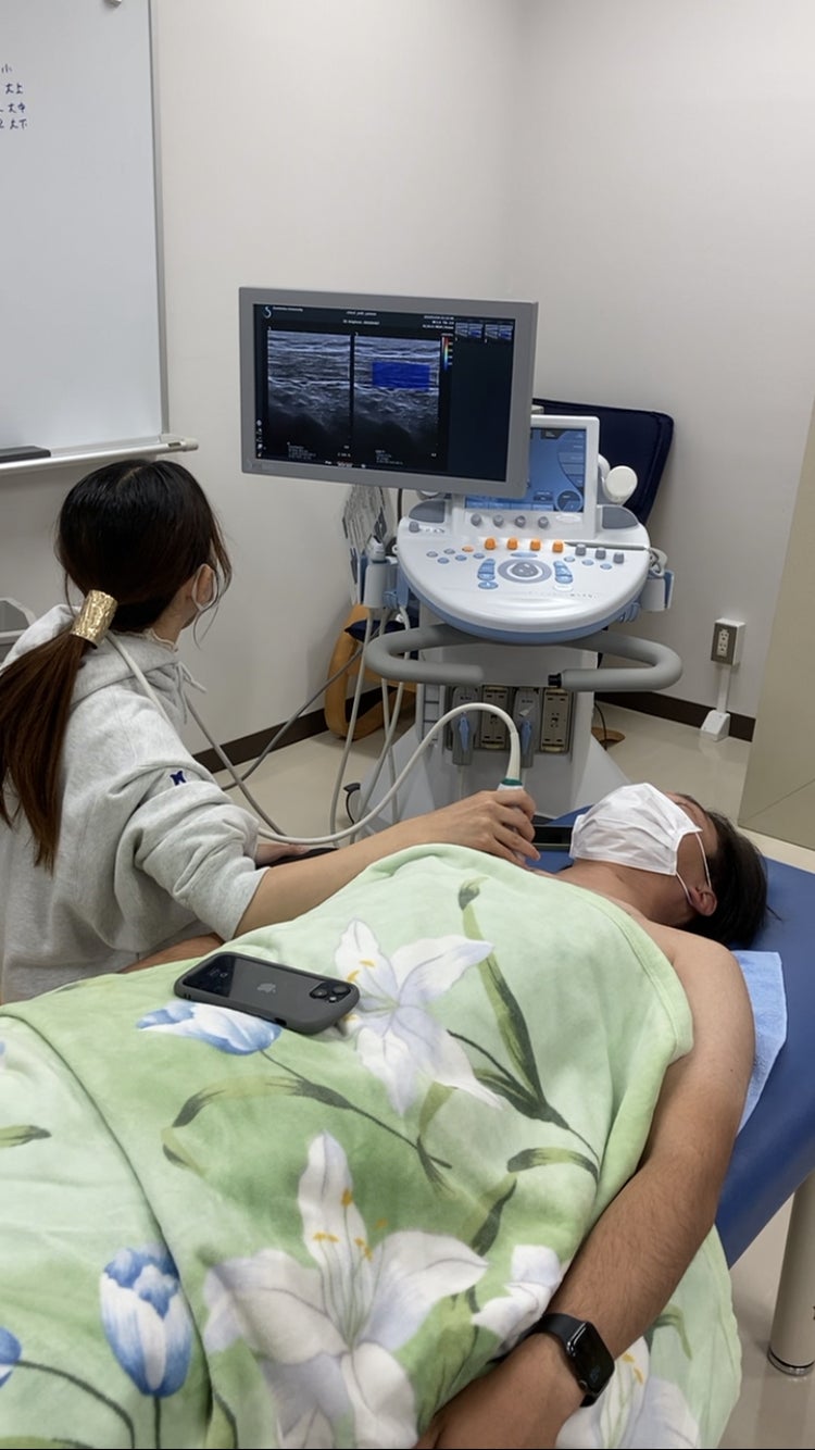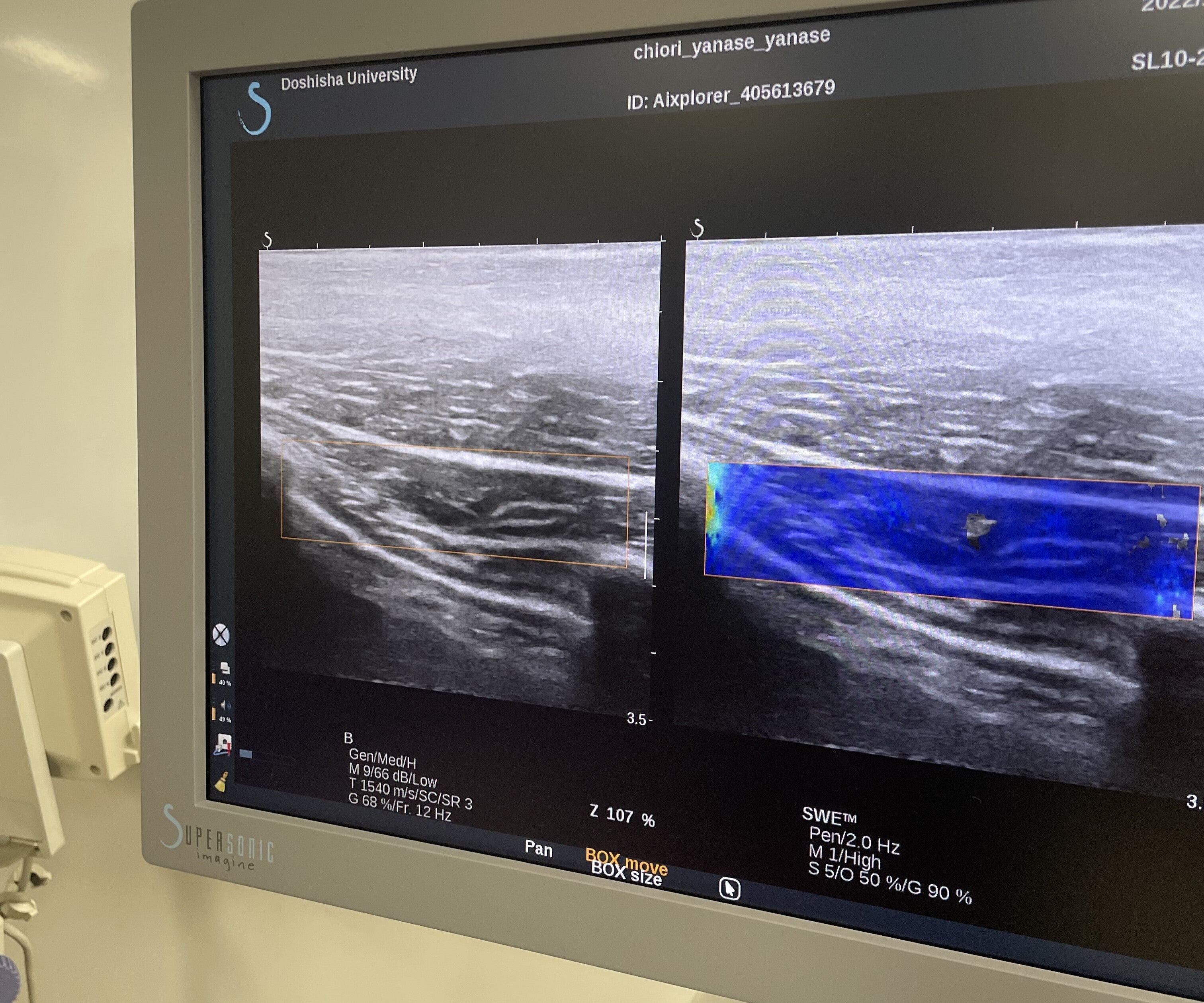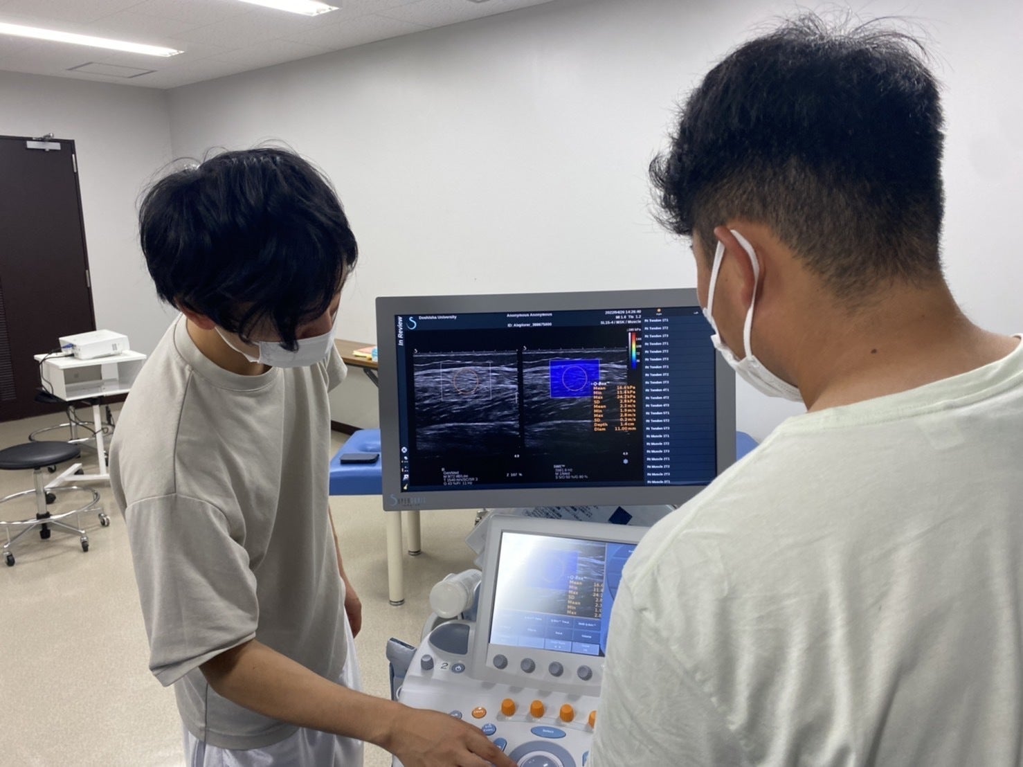その課題前後において、筋肉の硬さを測定することができる機械(超音波エラストグラフィ)を使い、肩についている筋肉(僧帽筋)の硬さを計測しました。さらに、背骨の歪みを計測できる機械(スパイナルマウス)を使い、計測しました。