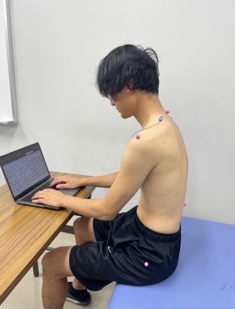 健康な大学生27名を集め、筋肉の硬さを測定することができる機械(超音波エラストグラフィ)を使い、胸の前にある筋肉(小胸筋)と背中にある筋肉(僧帽筋)の硬さを計測しました。さらに、背骨の歪みを計測できる機械(スパイナルマウス)を使い、猫背の程度を計測しました。そして、各筋肉の硬さと猫背の関係を調べました。