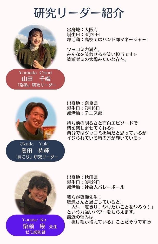 簗瀬ゼミ学生:奥田祐輝、山田千織、鈴木梨奈、杤岡武奎、橋本和樹、坂本来羅、椿原響、脇田真緒、村上稜弥、板谷颯