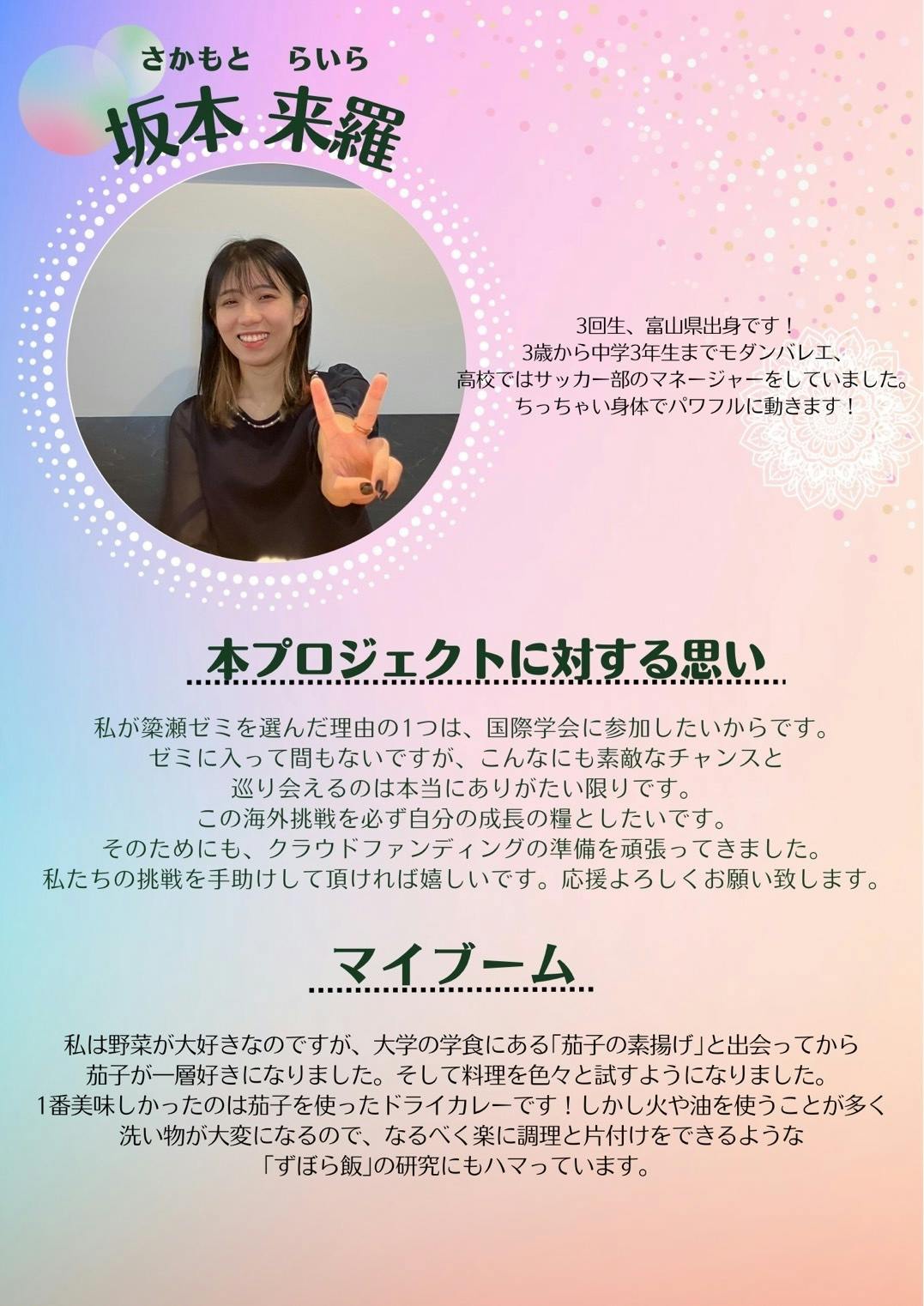 らいらちゃんはいつも何事にも一生懸命に取り組んでいます!クラウドファンディングに関しても熱意を持って取り組み、頑張っています。サッカー部のマネージャーをしていたこともあり、とても気遣いが素敵です!! 奥田祐輝