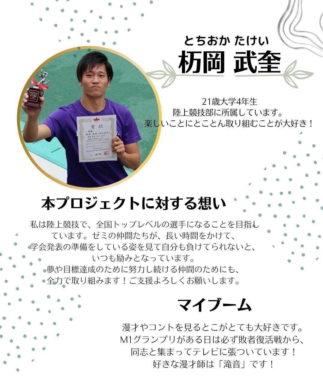 とっちは日本でトップレベルのアスリートですが、人間としてもトップレベルです。いかなる状況でも相手と自分自身のメリットを考え、ポジティブに行動できます。本当に尊敬しています。クラファンのリターンでは、日本学生選手権入賞&関西学生チャンピオンであるとっちによる陸上教室を設定していますので、どうぞ選んでみてください。充実した時間・空間になること間違えありません! 簗瀬康