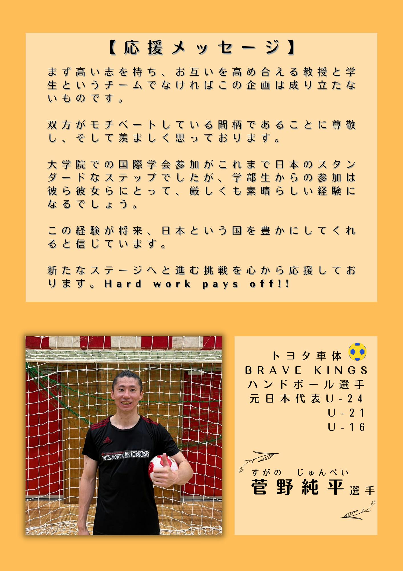 脅威の大食いである私より、ノリノリで食べる大切な友達です!笑 でも食べる時以外は、よーく深ーく考える慎重派。真面目で何事にも真剣だなーと尊敬しています。 椿原響めっちゃ話しやすい生粋の大阪人で、とっても美味しそうにご飯を食べるまおちゃんですが、すごく頼り甲斐があり、話し合いの時には的確な意見をたくさん出してくれます!僕はそんなスーパーウーマンなまおちゃんのことを勝手に僕らの代のリーダーだと思っています笑 村上稜弥真緒さんは昨年、カナダ留学をしました。その経験を活かし、今回の国際学会では海外の研究者とディスカッションをしてくれることを期待しています。 簗瀬康