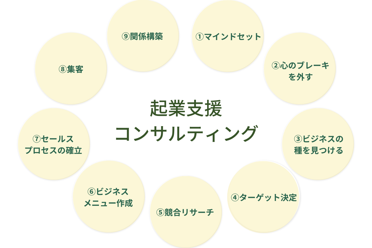 この図にある通り、起業のマインドセットに始まり、最後にあるビジネスの関係構築まで寄り添いながら一貫サポートしていくことが、私の起業コンサルティングの強みです。その中でも最も得意としているのが、①マインドセット、②心のブレーキを外す、③ビジネスの種を見ける、という分野です。