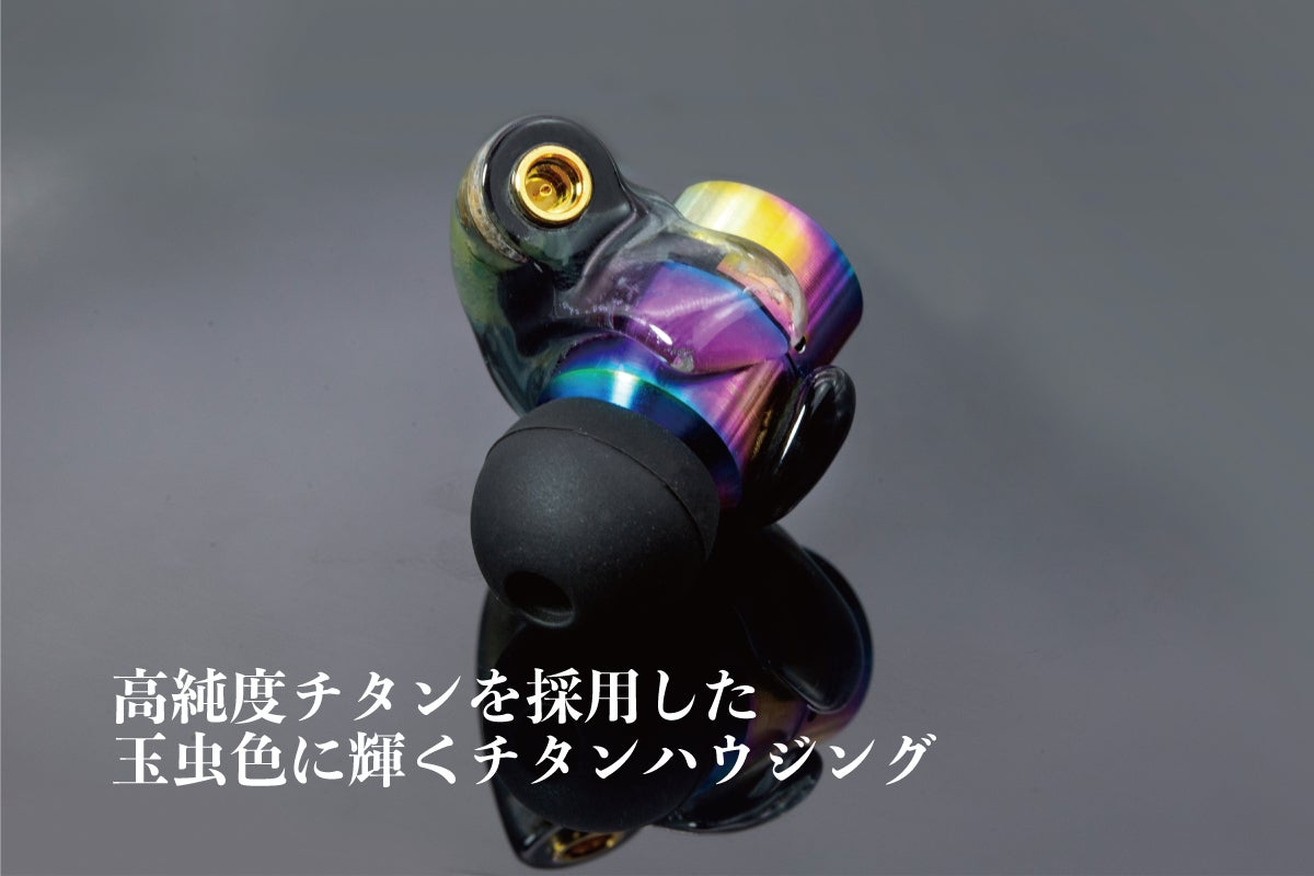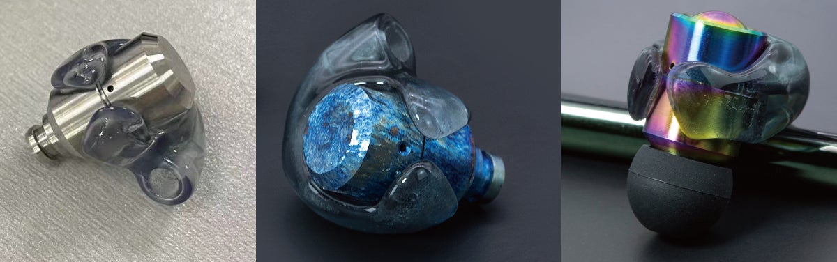 実は、チタンの部分を焼き付ける加工自体も初の取り組みで、これまでイヤホン業界でチタンのハウジングをこのように焼き付けたアイデアはあまり無かったのかなと思っています。チタンのPVD加工や焼き付け加工は、ひとつひとつ違う味がでるのであまり採用されにくいのかもしれないです。試作段階ではいろいろなパターンがありました。どのカラーにするかもアンケートをとると半々の結果で、結局最後にサンプルで取り寄せたPVD加工によるチタンの色にしました。(アンケート結果は無視するカタチになってしまい申し訳ないですが・・・)