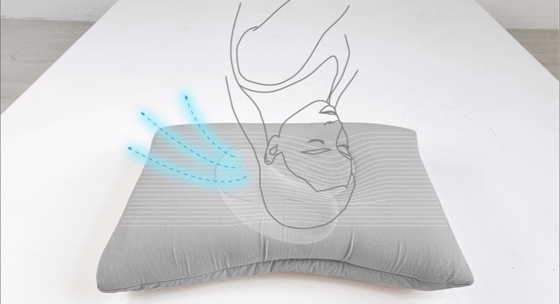 1日のうち10〜30回は寝返りをしているといわれています。KUKI PILLOWは、支柱構造に囲まれAirドームを形成しているので、寝返りの度にポンプ動作が作用し枕内部の空気を循環・換気させます。