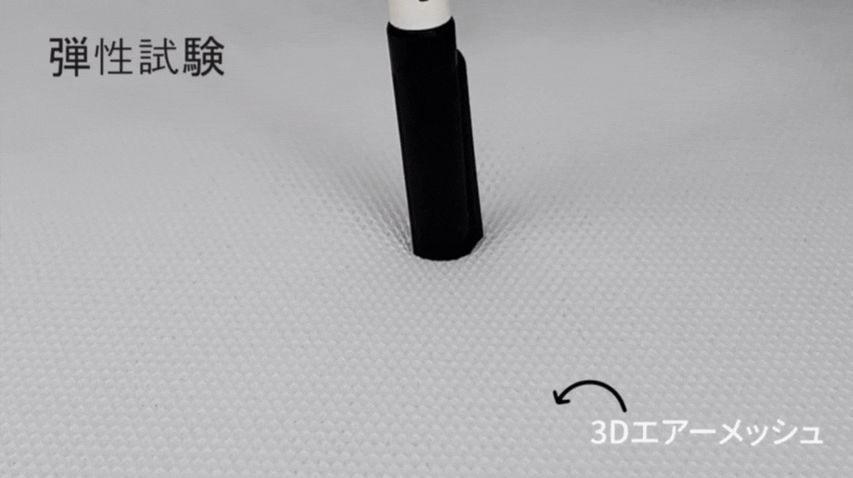※素材の”弾性”をわかりやすく表現するために製品に使用されている3Dメッシュを重ね厚みを増やして実験しています。実際に商品に使用している3Dメッシュでは再現できません。
