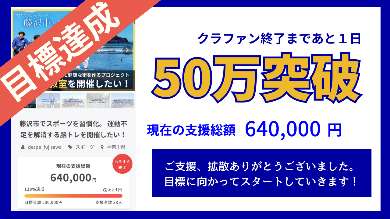 2023/05/19 23:07お世話になっております。デスペルーホ藤沢 タイヨウです!!本日のお昼ごろ、クラウドファンディングの目標金額である50万円を達成しました!ご支援いただいた皆様、本当に感謝申し上げます。正直、最初の活動報告の方でも書かせていただいた通り、クラウドファンディングでご支援をいただくことはできるのか不安でいっぱいでした。途中伸び悩んだ期間もあったり、初のクラウドファンディングでわからないことだらけでとりあえずできることに取り組むとともに、クラブのメンバーにも協力してもらい、色んな方にこのプロジェクトのことを認知していただけたのではないかと思います。今までお世話になった方にお声かけしたり、オンライン・オフラインのさまざまな場面で宣伝させていただいたり、ちょっとうるさいなぁって思うくらい発信した結果、その思いが伝わったのかなと思います。まだ残り24時間ほど残っています。目標金額を達成してからもたくさんのご支援をいただいており、本当に感謝の気持ちでいっぱいです!クラウドファンディングの終了まであと少し、お付き合いいただければと思います!今後の思いなどはクラウドファンディング終了後に書かせていただきたいと思います。ここからが本当のスタートです!!取り急ぎご報告までに。 もっと見る