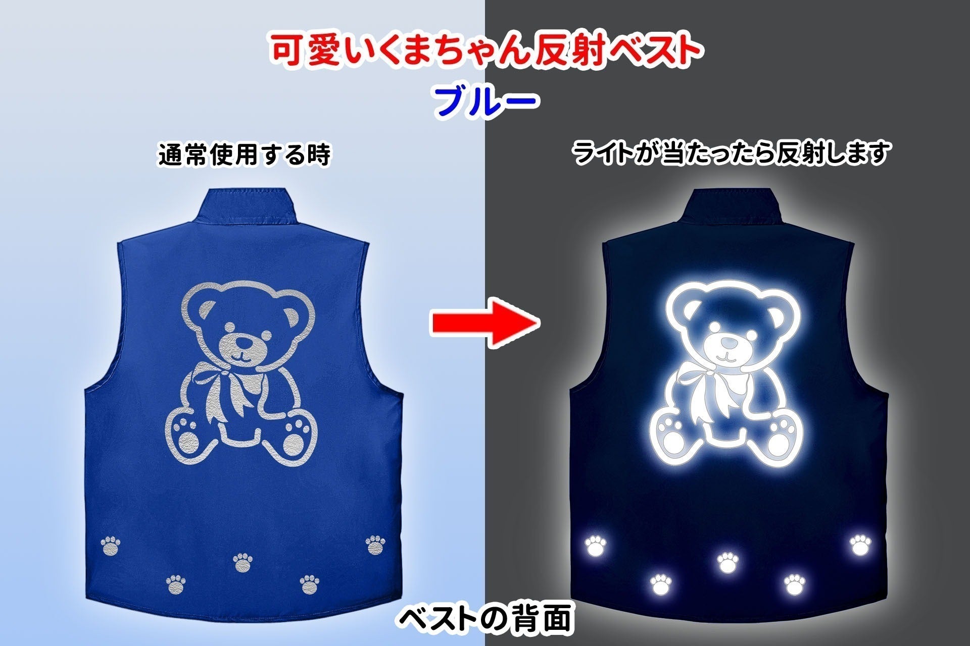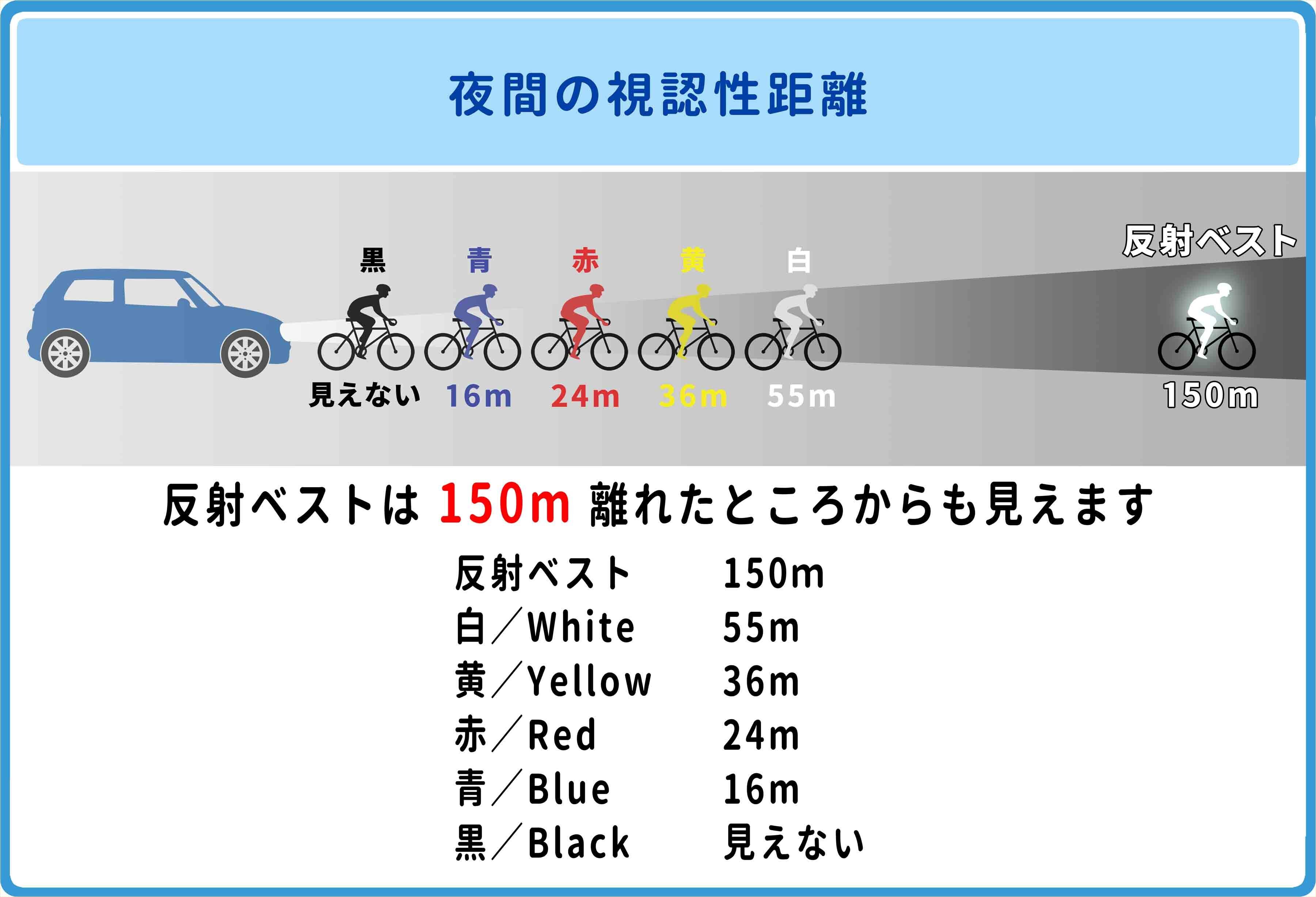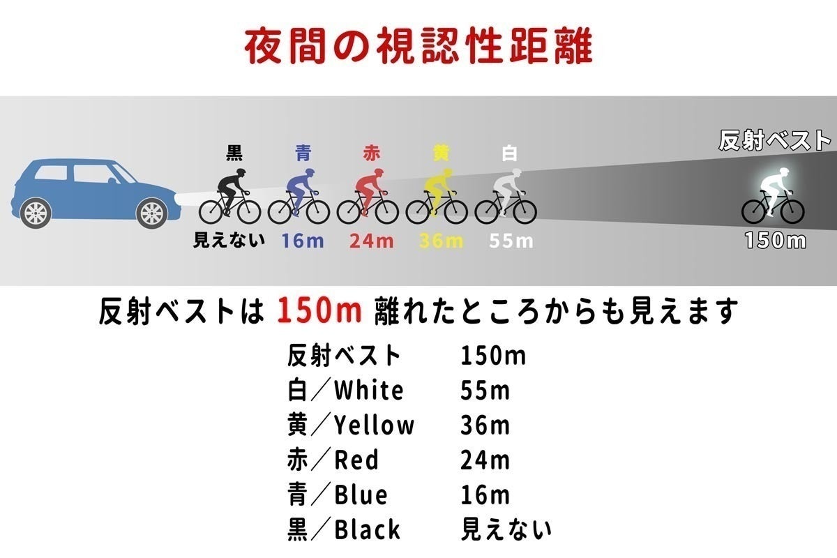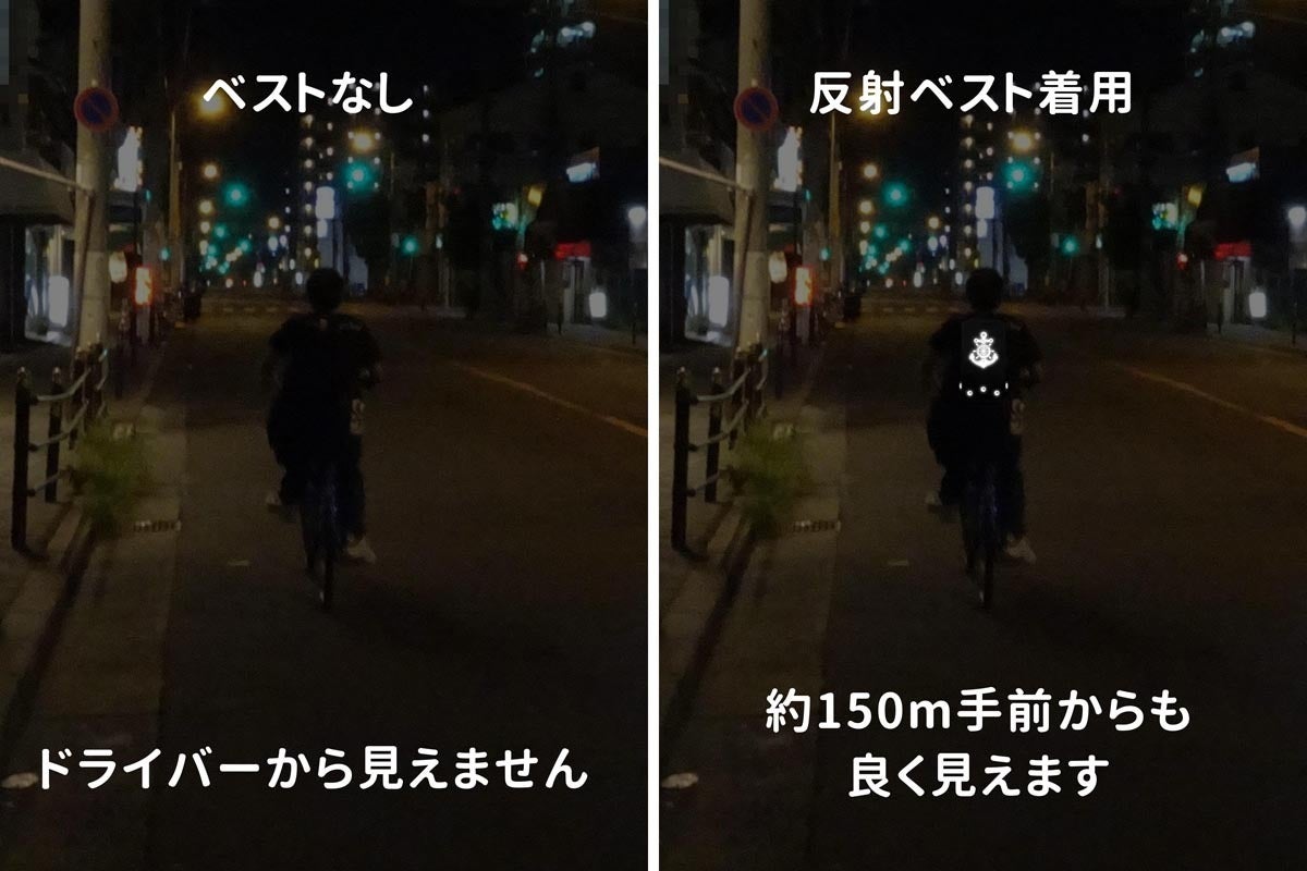 反射ベストを着用すると、視認性がこれほど変わります。 下の表では、どれだけの違いがあるかを確認できます。