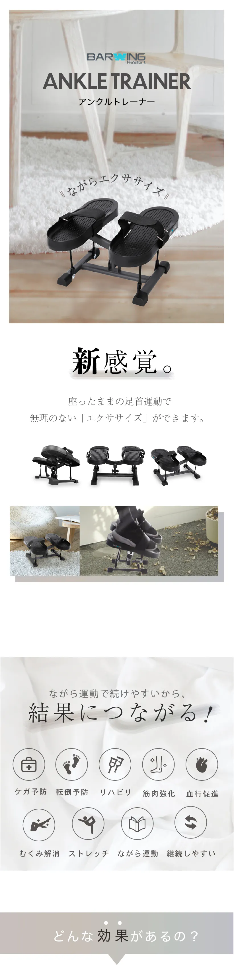 アンクルトレーナーは、ふくらはぎや足首、もも裏のストレッチ、ふとももの強化など、1台でさまざまな箇所のエクササイズが可能です。