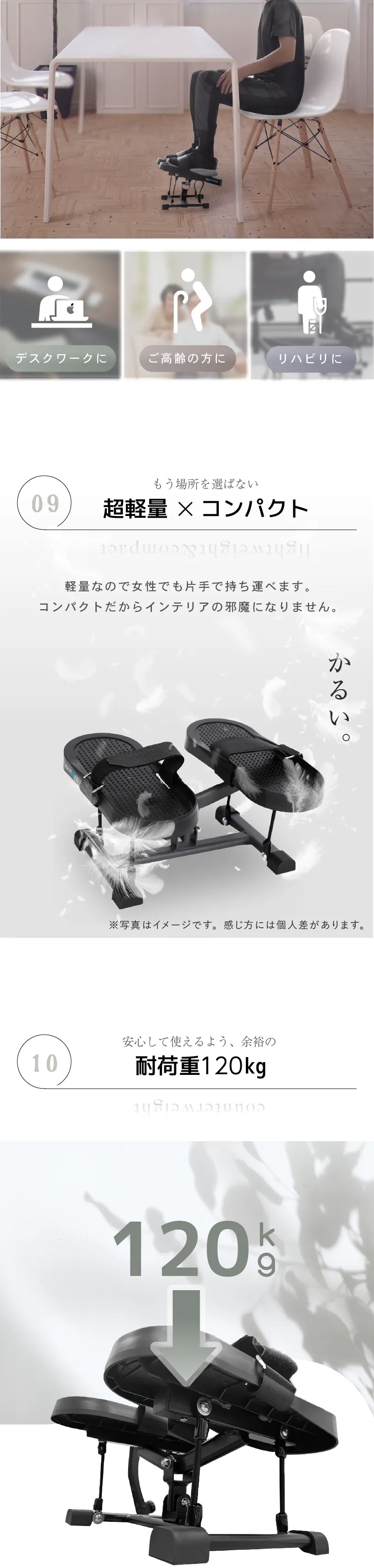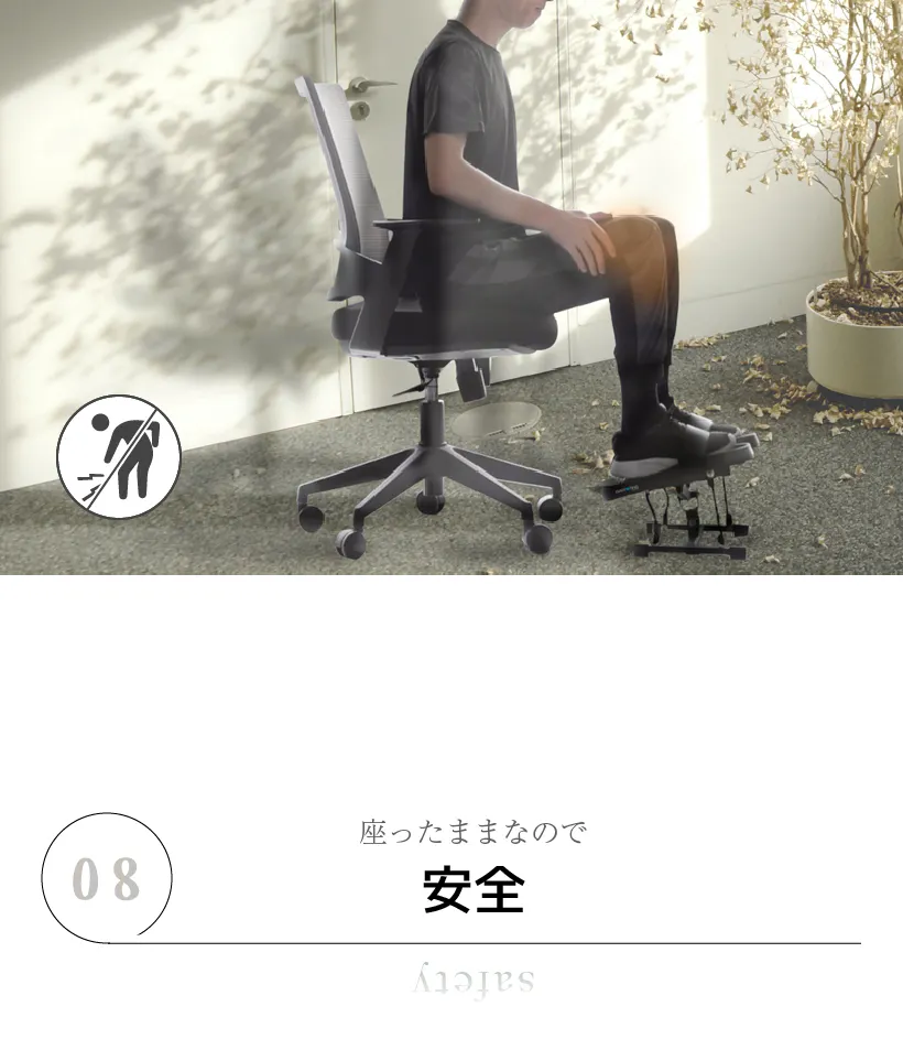 座ったままの運動なので、転倒やケガのリスクを減らせます。ご高齢の方やリハビリなど、様々な方にご使用頂けます。