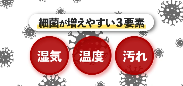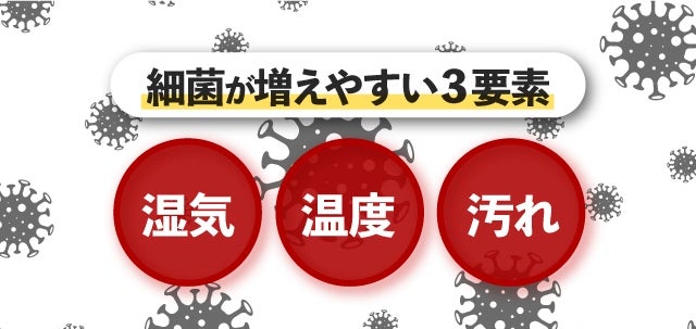 なぜキッチン用スポンジに多くの細菌がいるのかというと、細菌が増えるために必要な「湿気」「温度」「栄養(汚れ)」の3要素が揃っているから。