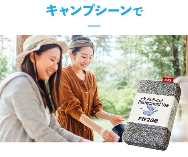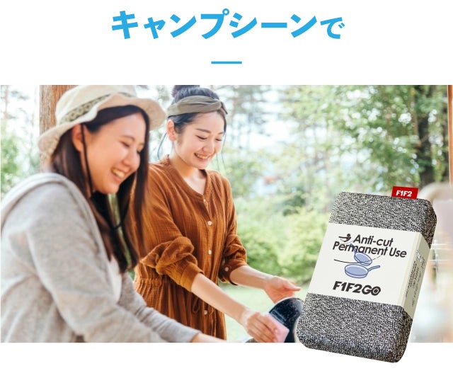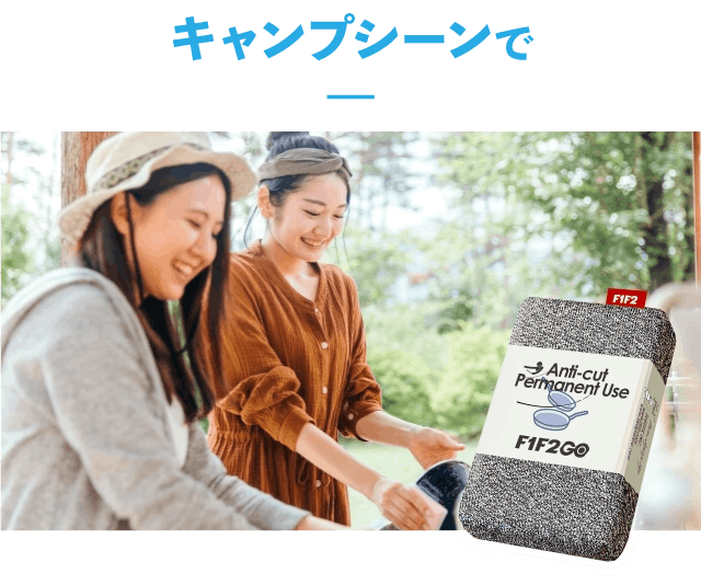 鋭利なものや温度の高いものを洗うことの多いキャンプシーンでもF1F2GOは活躍します。炭のついたキャンプ道具を洗う度にスポンジを捨ててはもったいないです。