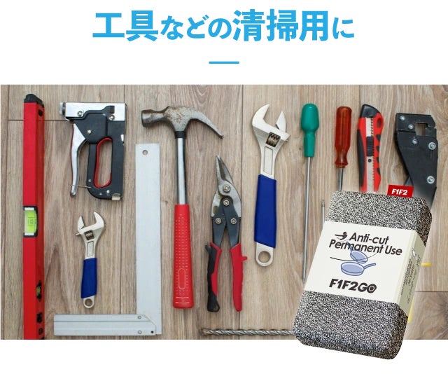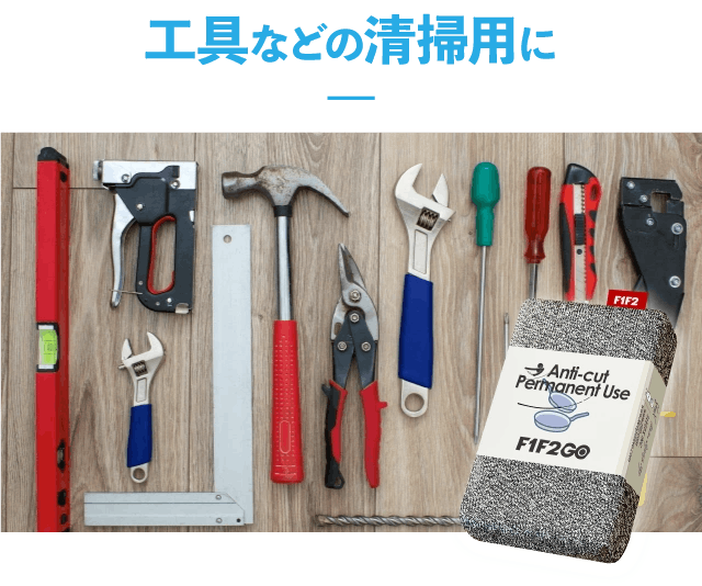 汚れた工具を洗うスポンジとしてもF1F2GOは最適です。 鋭利な部分に対して、強靭な特殊繊維が活躍すること間違いなしです。