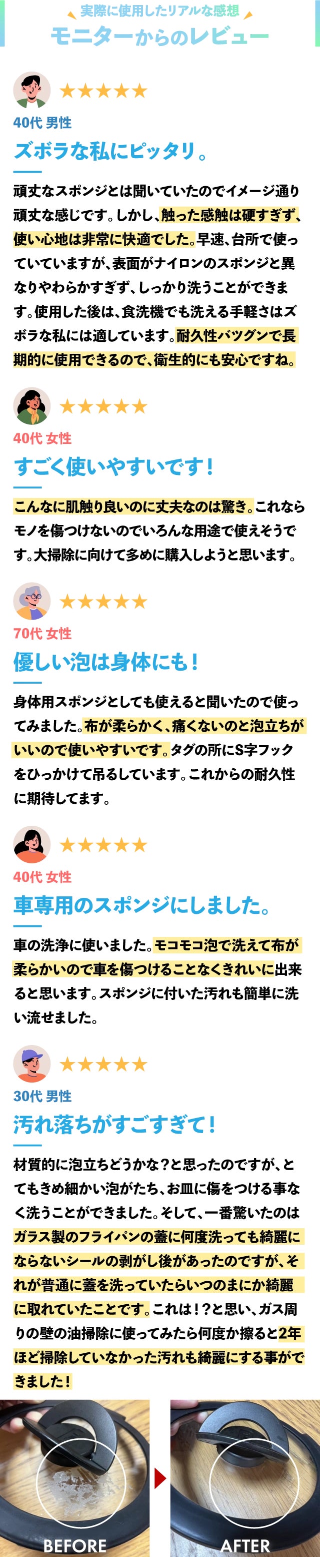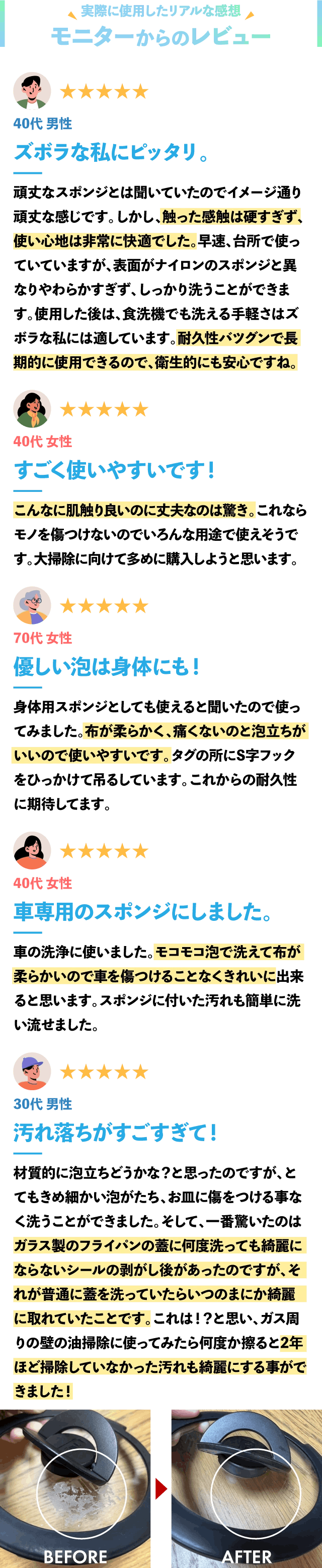 結果はページでご覧の通りです。汚れ落とし、泡立ち、耐久性抜群のこのスポンジが、みなさまの日常の作業をスムーズにするお手伝いができますように。