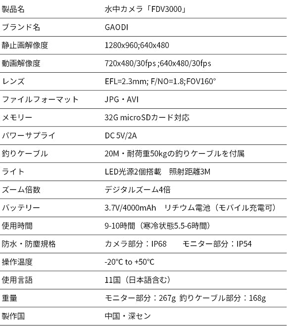 「FDV3000」は、広角160°レンズ・100万超高画素数カメラで海底の様子を詳細に観察でき、即時にHD静止画・動画で記録可能。また、手元のリールでケーブル制御可能、LEDの集魚ライト搭載の高機能水中カメラです。