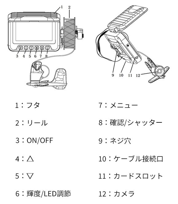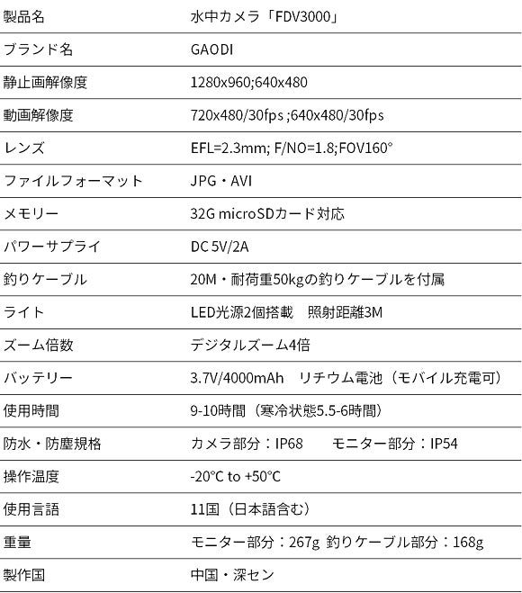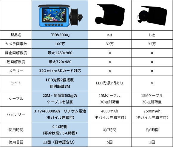 「FDV3000」は、広角160°レンズ・100万超高画素数カメラで海底の様子を詳細に観察でき、即時にHD静止画・動画で記録可能。また、手元のリールでケーブル制御可能、LEDの集魚ライト搭載の高機能水中カメラです。