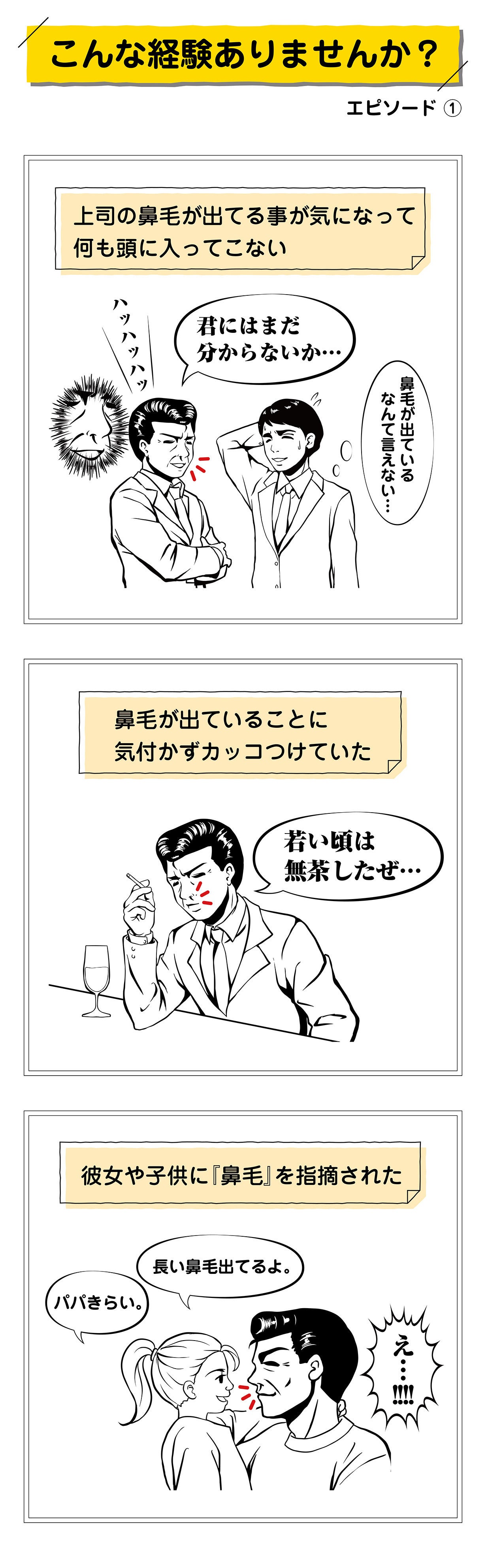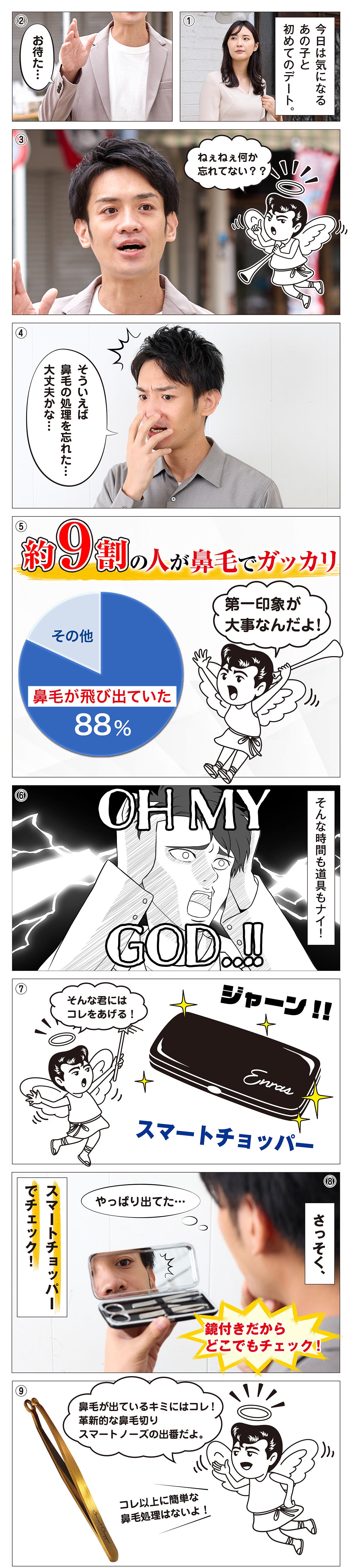 年頃になり少し距離を感じていた娘と久しぶりの外食にでかけたある日。お店で娘が私に発した一言。『パパ!!鼻毛スゴイ出てるよ!!』まさか!!!今朝、【鼻毛処理】もしっかりやったはずなのに…私は、どれ程の【スゴイ鼻毛】が出ているのかも直ぐには確認出来ず、ただただ恥ずかしさとショックで笑って誤魔化すのが精一杯でした。そんな時、気軽に持ち歩けて簡単にムダ毛を確認し処理の出来るエチケット用品があれば「鼻毛が出ている父親」と言うイメージをスグに払拭出来たのではないかと思いました。そこで、コンパクトに持ち運べて、場所を問わずにチェックして処理の出来る【スマートチョッパー】を企画しました。
