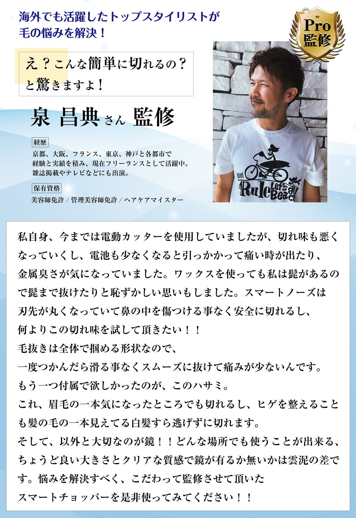 その一心で品質をこだわり続け、毛の専門家でもある美容師の泉 昌典さんに監修していただき、私たちの理想とする「スマートノーズ」「スマートチョッパー」が完成しました!!