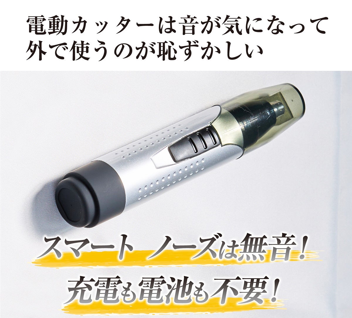 「鼻毛処理をしよう!」と思った時に、電動音を気にしたり、スイッチをいれたら電池切れ。なんて心配をする必要もないので、処理したくなったらいつでもどこでもスマートチョッパーの出番です。